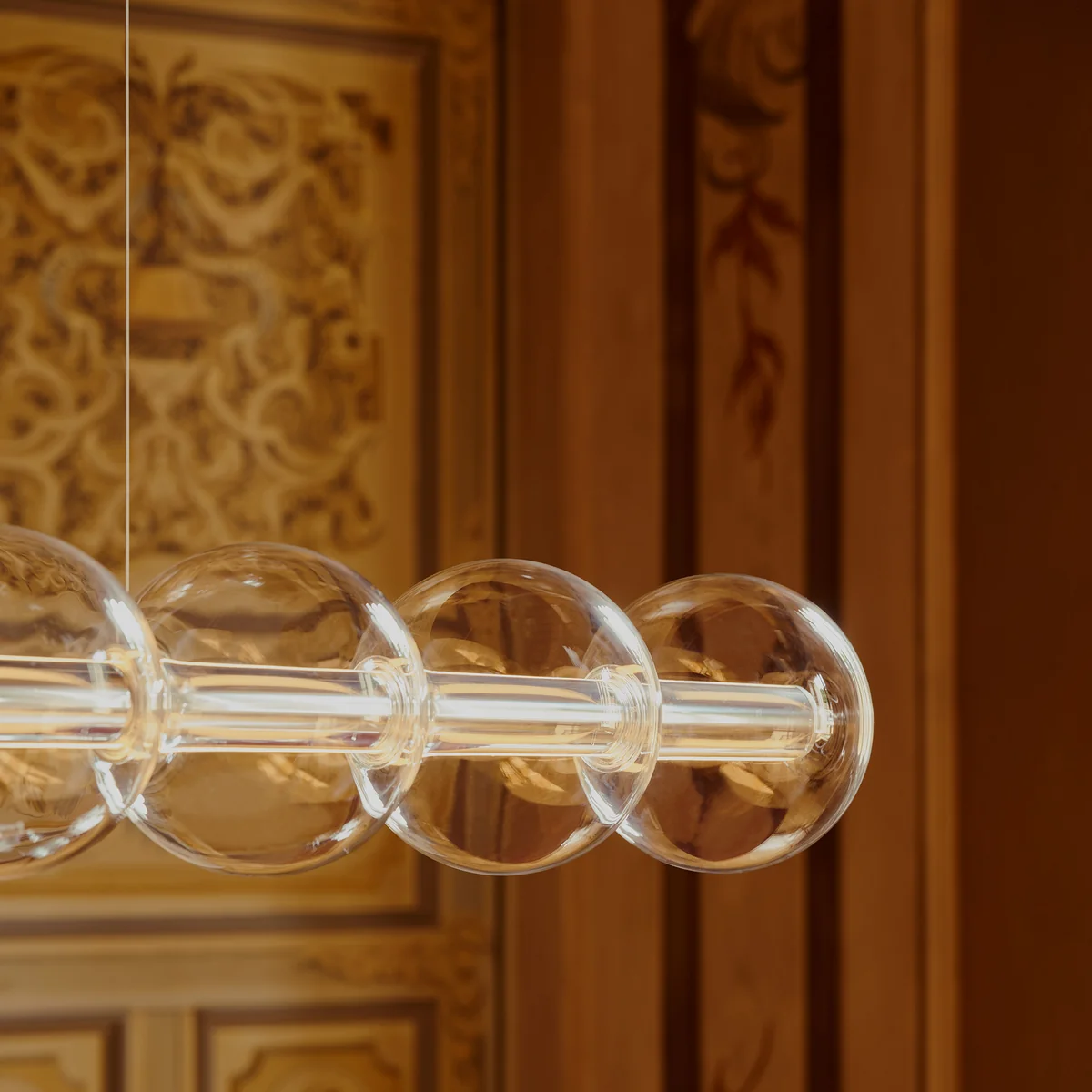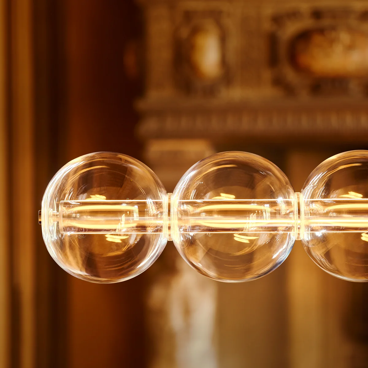 Umschlossen wird die Leuchte von einer Abfolge mundgeblasener, transparenter Glaskugeln, die durch filigrane Distanzstücke voneinander getrennt sind. Diese rhythmische Anordnung verleiht der Leuchte eine schwebende Leichtigkeit und macht sie sowohl einzeln als auch in Reihen installiert zu einem skulpturalen Highlight zeitgenössischer Lichtgestaltung.