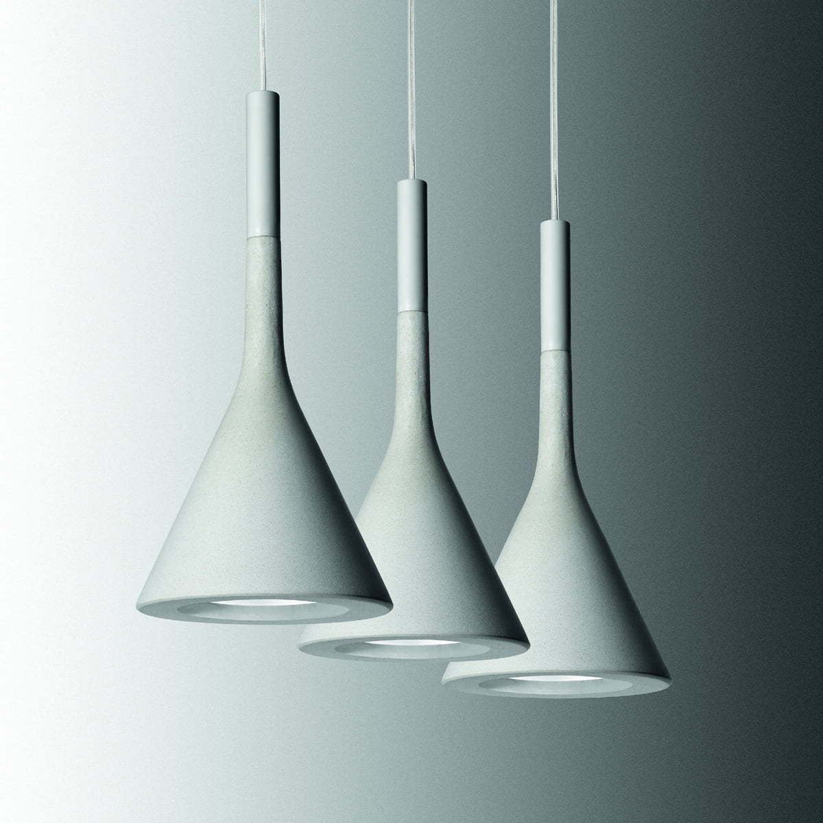Die Pendelleuchte Aplomb von Foscarini kombiniert den Werkstoff Beton mit einem sachlichen und gleichzeitig dekorativen Design. Der Entwurf der Leuchte stammt von den Designern Paolo Lucidi und Luca Pevere.