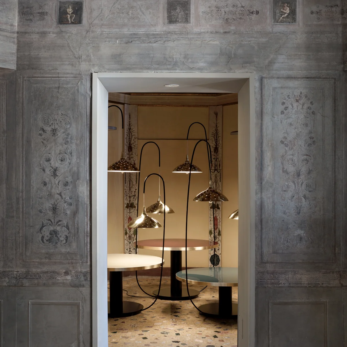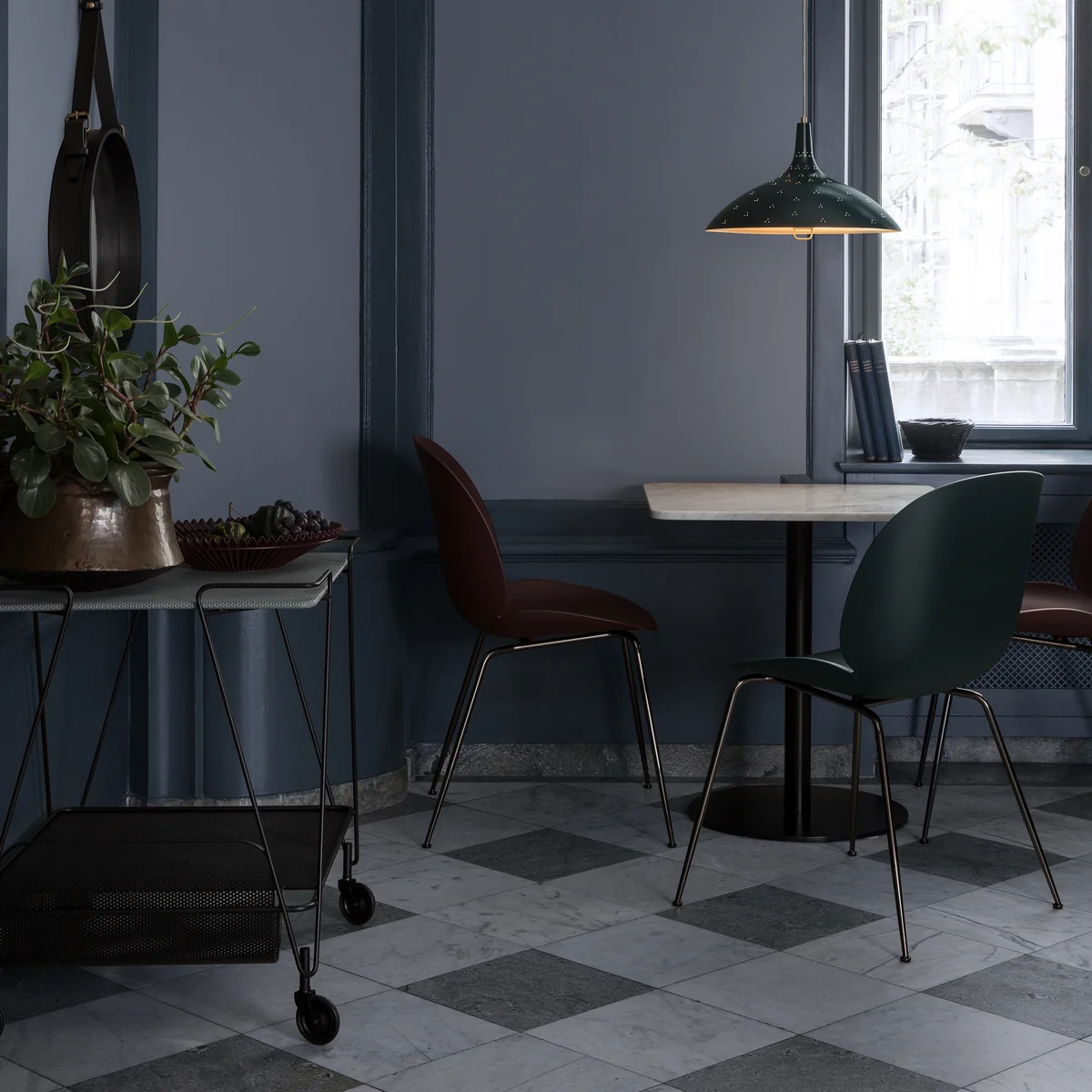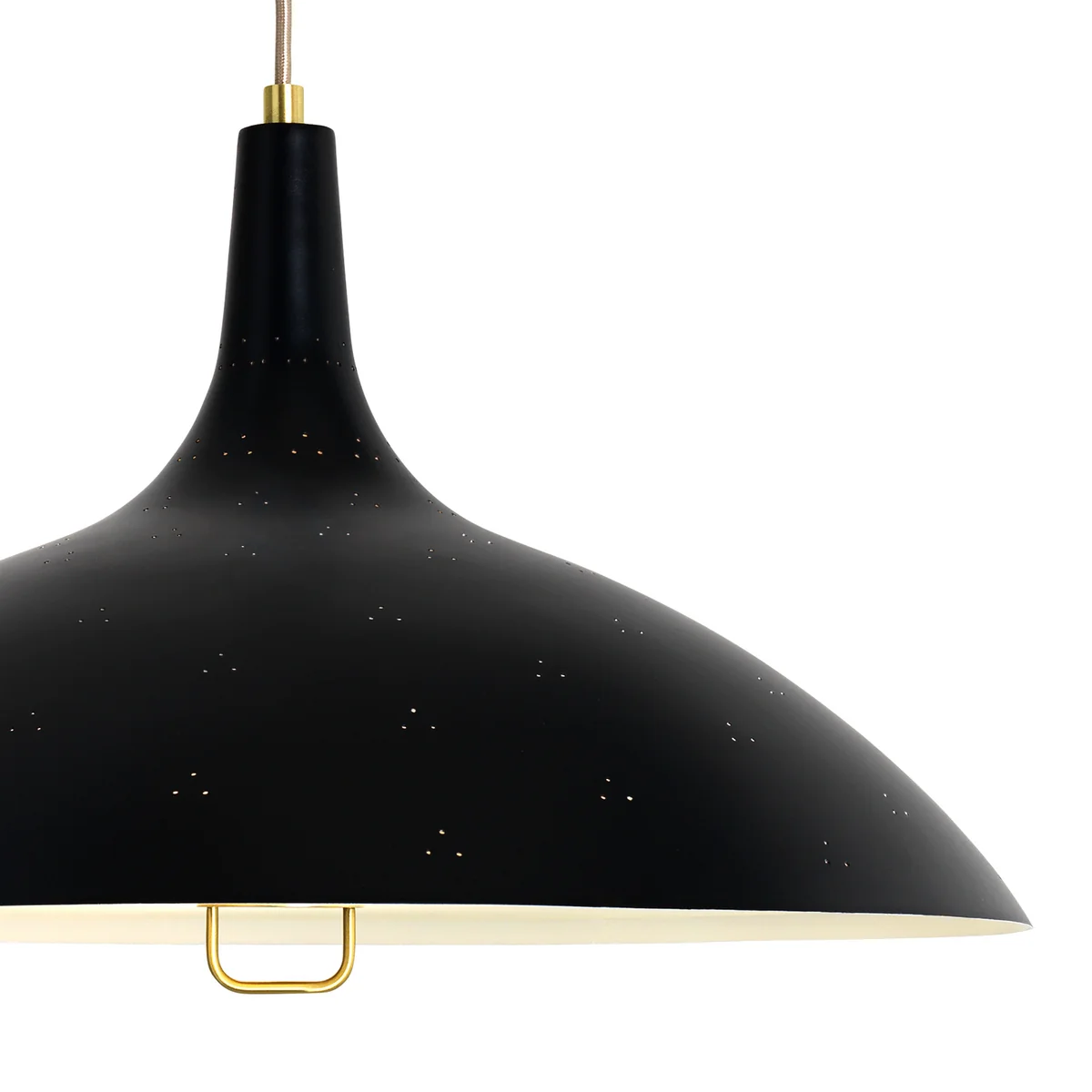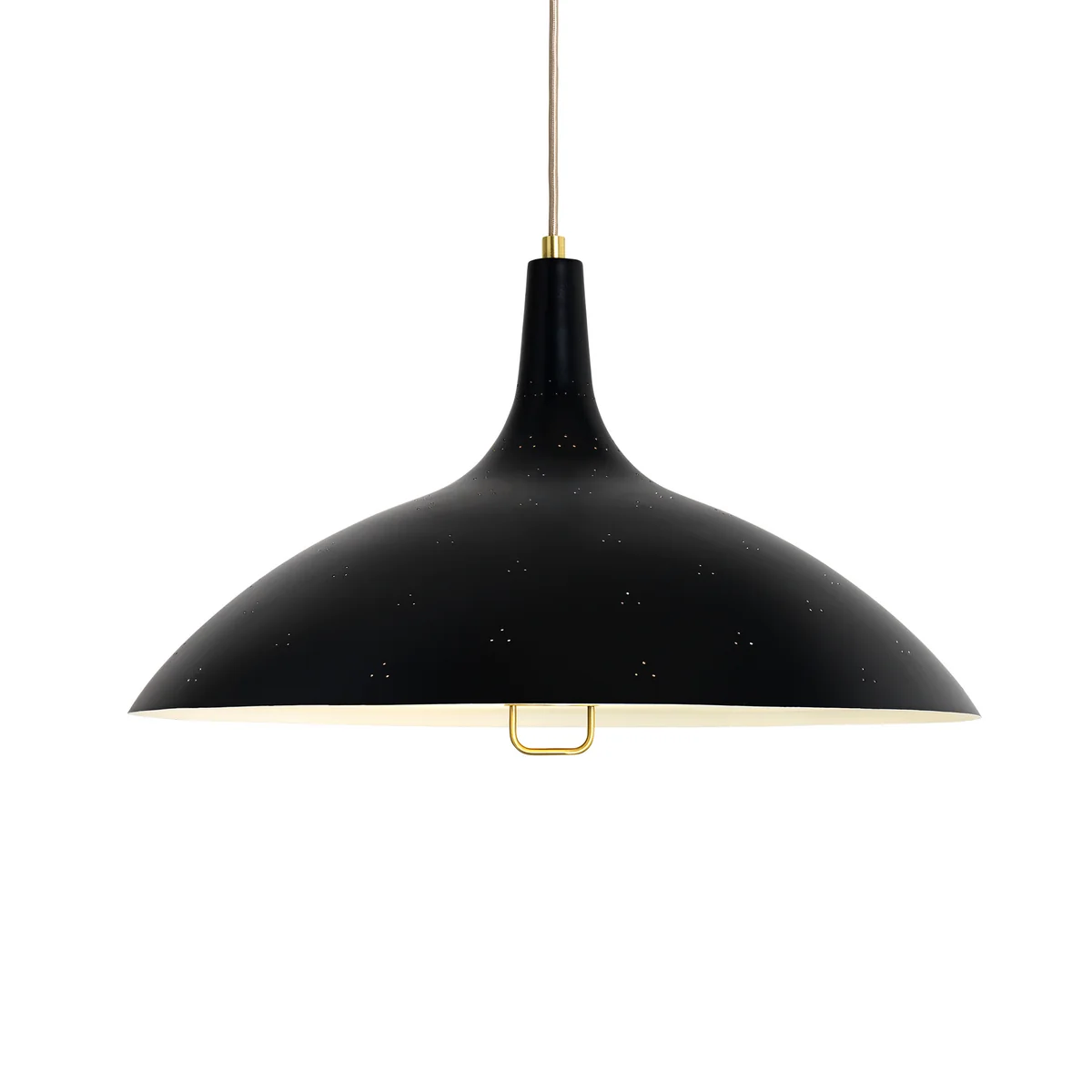 Die 1965 Pendelleuchte von Gubi wurde ursprünglich von Paavo Tynell im Jahr 1948 entworfen. Wie viele seiner bekanntesten Designs wurde die Leuchte für das Finland House in New York entwickelt. Die Leuchte überzeugt durch das dreieckige Perforationsmuster, ein künstlerisches Detail, welches das Licht auf besondere Weise hindurchscheinen lässt und sich in vielen Objekten von Tynell wiederfindet.