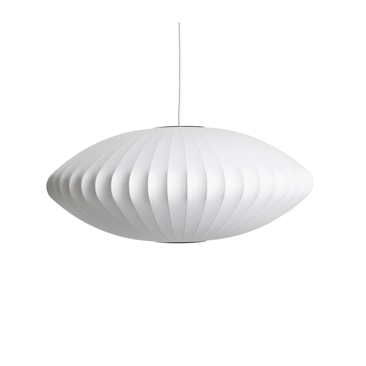 Die Nelson Saucer Bubble Pendelleuchte ist ein ikonisches Designobjekt aus der Mid-Century-Ära. Entworfen 1952 von George Nelson, zählt sie bis heute zu den Klassikern modernen Interior Designs. Mit ihrer sanft organischen Form und dem off-white Schirm aus transluzentem Polymer schafft sie ein warmes, diffuses Licht, das Wohn-, Ess- oder Schlafzimmern eine behagliche Atmosphäre verleiht.