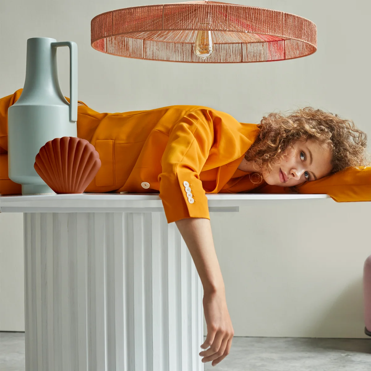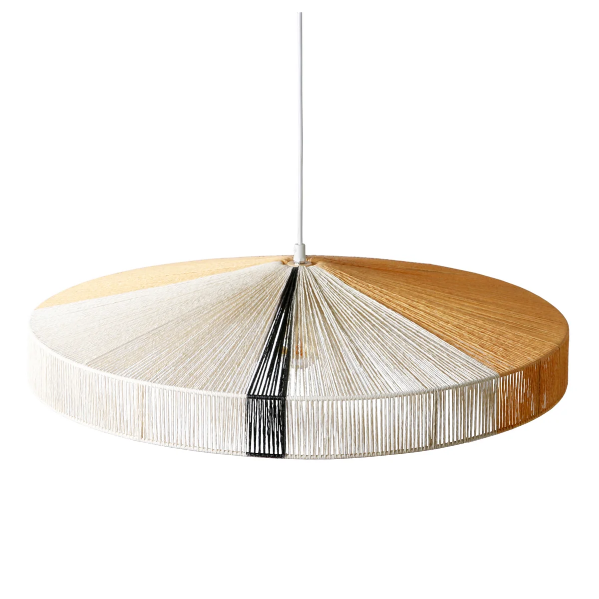 Gehalten werden die gespannten Seile von einem Stahlgestell. Die Form des Schirmes sorgt für eine angenehme Lichtverteilung nach unten, weshalb sich die Leuchte besonders gut über Tischen und Kücheninseln einsetzen lässt. Der durchlässige Schirm gibt zudem Licht zur Seite und nach oben ab und taucht so jeden Raum in warmes Licht.