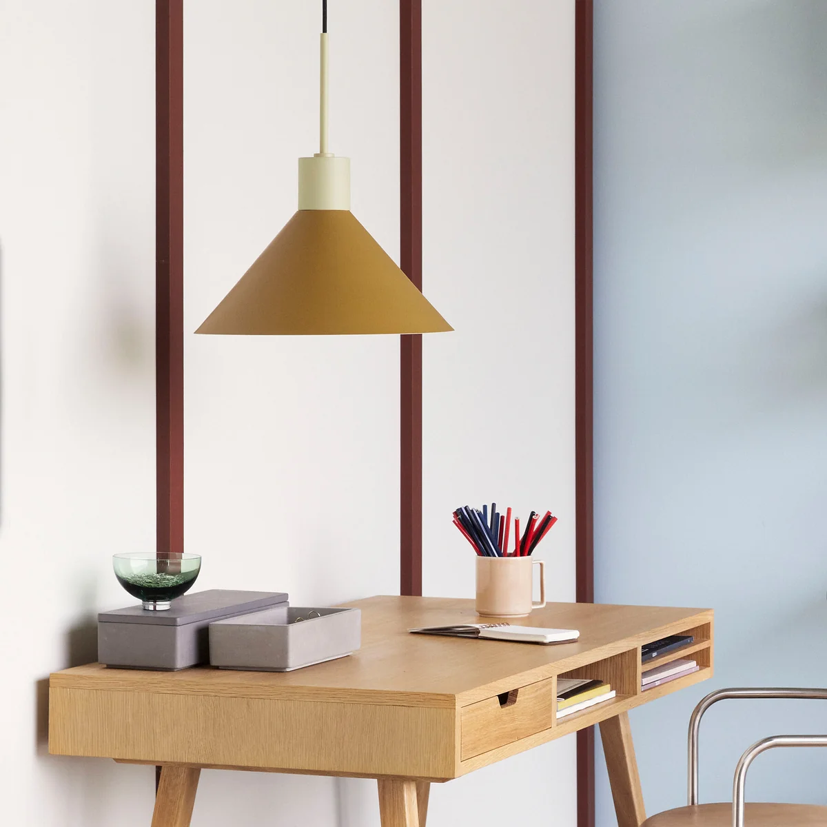 Die Metall Pendelleuchte von Hübsch Interior überzeugt durch ihr minimalistisches und zeitloses aussehen in bestechenden Farben. Der kegelförmige Lampenschirm wirkt in zwei Farben besonders dekorativ und wird so zum Hingucker über dem Esstisch im Wohnbereich.