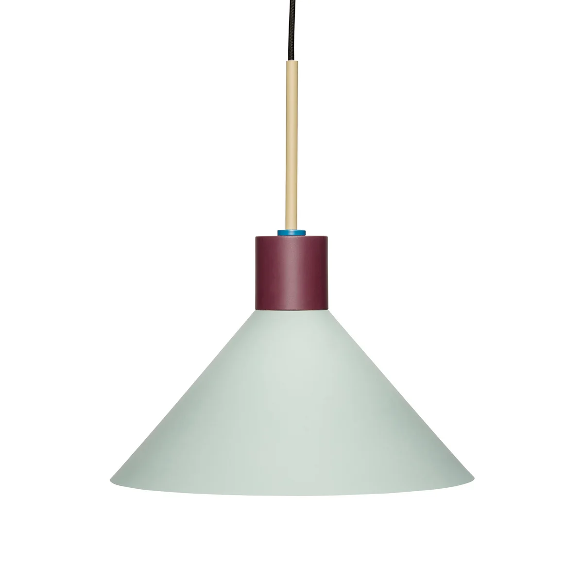 Die Metall Pendelleuchte von Hübsch Interior überzeugt durch ihr minimalistisches und zeitloses aussehen in bestechenden Farben. Der kegelförmige Lampenschirm wirkt in zwei Farben besonders dekorativ und wird so zum Hingucker über dem Esstisch im Wohnbereich.