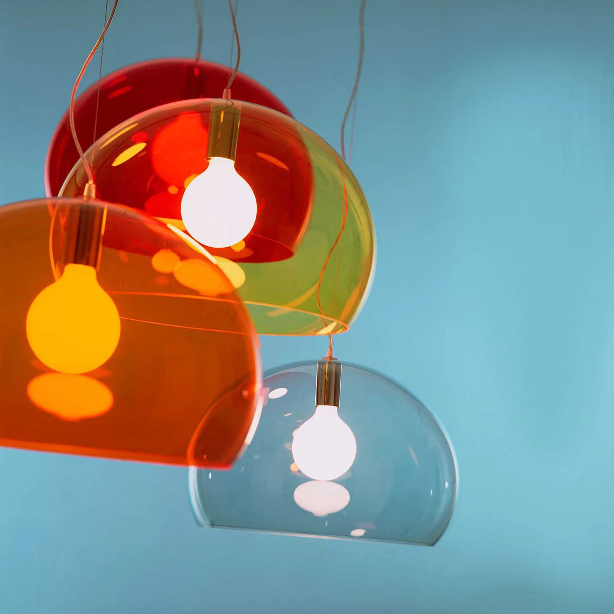 Als transparente Variante ist die Leuchte in einer breiten Auswahl verschiedener Farben erhältlich: von Grün bis Blau über Rot und Gelb sind alle Töne vertreten. Die besondere Transparenz des Materials und der reizvolle Glanz erinnern an eine Seifenblase, die im Sonnenlicht schillert.