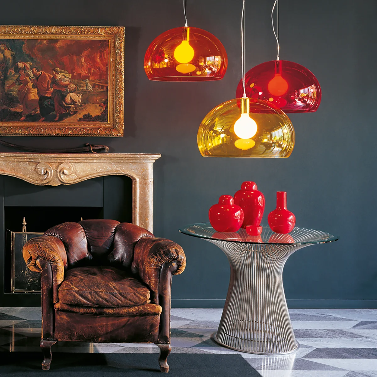 Neben den undurchsichtigen Modellen in den klassischen Nicht-Farben Schwarz und Weiß ist die Pendelleuchte FLY zudem in den überaus eleganten Metallictönen: Chrom, Gold und Kupfer erhältlich. In den schimmernden Tönen ist die Kartell Pendelleuchte ein schimmerndes Schmuckstück für jede Decke.