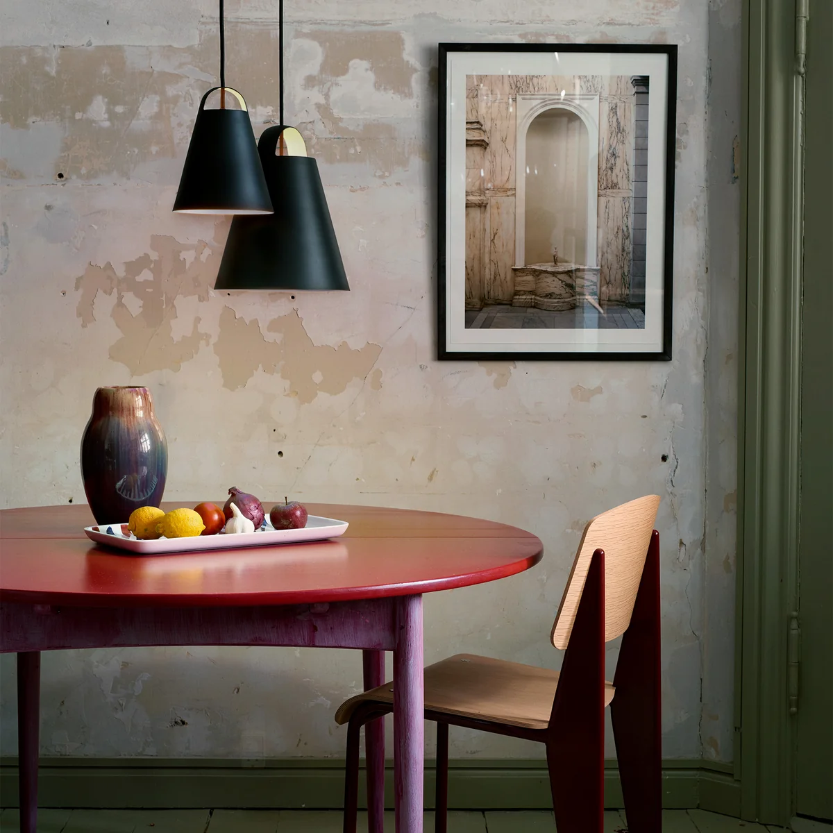 Die Above Pendelleuchte von Louis Poulsen ist die erste Leuchte des dänischen Designers Mads Odgård für den Leuchtenhersteller. Sie bildet grafisch gesehen ein Dreieck und strahlt sowohl nach unten als auch nach oben, durch die bogenförmige Öffnung, Licht ab.