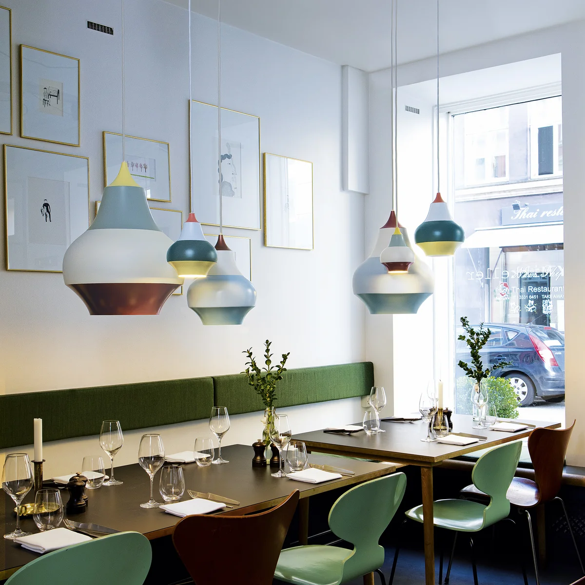 Die Leuchtenserie eignet sich für Restaurants, Cafés und Bars ebenso wie für die heimische Küche oder das Esszimmer. Dank der matt weiß lackierten Innenseite spenden die Leuchten ein weiches, nach unten gerichtetes Licht, das in „normaler“ Höhe blendfrei ist. Dabei eignet sich die Leuchte vor allem zum tieferen Hängen über Tischen oder Tresen, wo sie in unterschiedlichen Varianten farbenfrohe Akzente setzt. Dank E27 Fassung kann die Leuchte mit unterschiedlichen Leuchtmitteln ausgestattet werden, sodass Farbwiedergabe und -temperatur des Lichtes individuell bestimmt werden können.