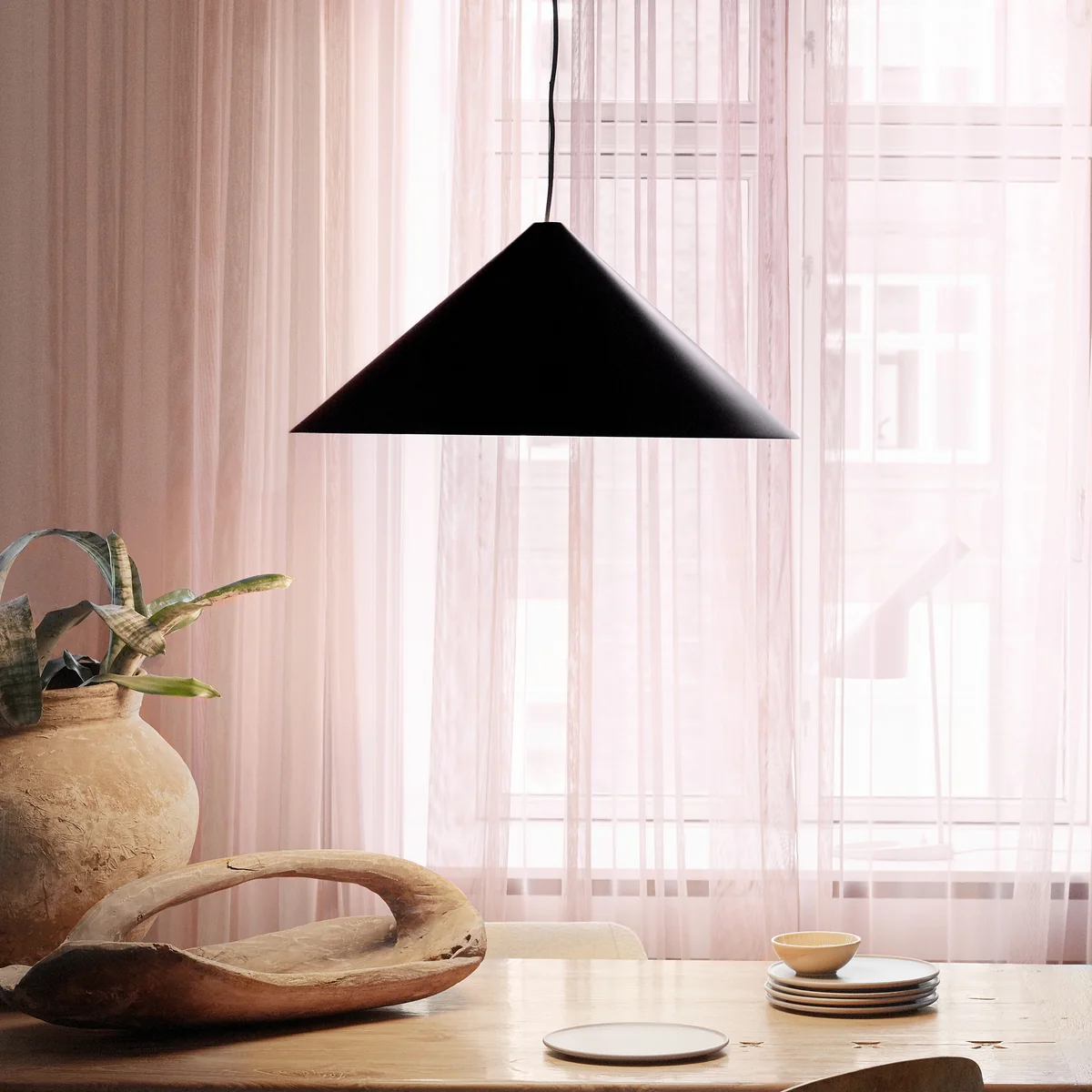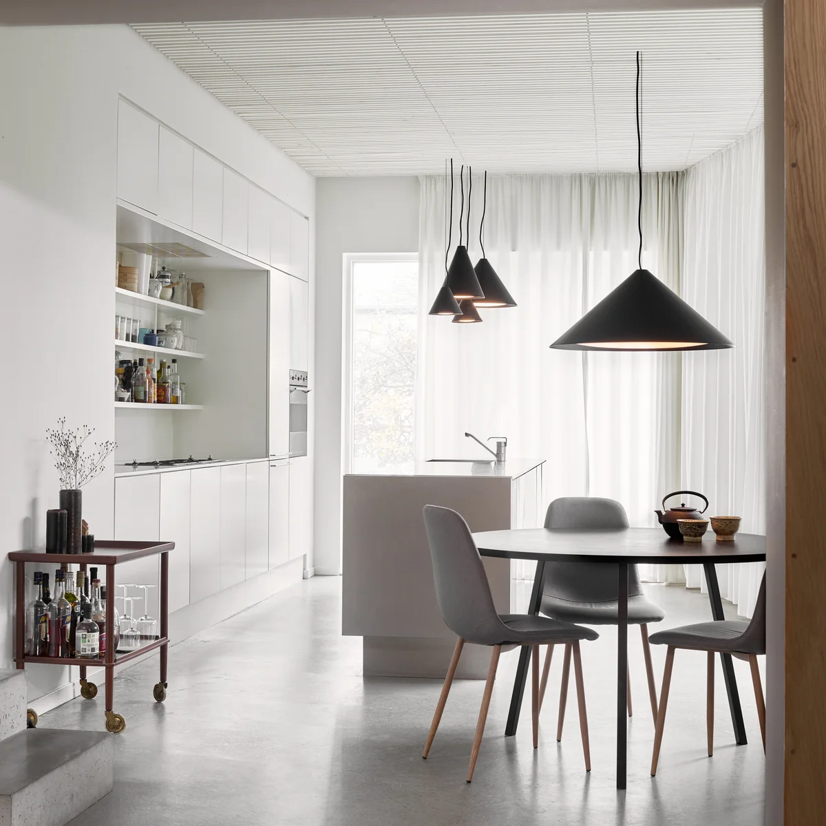 Die Keglen LED-Pendelleuchte von Louis Poulsen überzeugt durch einen markanten kegelförmigen Schirm. Die Leuchte ist in verschiedenen Formen erhältlich, wobei jede Schirmausführung eine ganz eigene Lichtstreuung bewirkt und die Innenseite das Licht auf angenehme Weise nach unten reflektiert. Durch eine gleichmäßige, unauffällige Öffnung auf der Schirmoberseite wird zusätzlich ein sanftes Licht nach oben gestrahlt, sodass eine harmonische Atmosphäre entsteht. Entworfen wurde die Leuchte von Bjarke Ingels und Jakob Lange von Big Ideas.