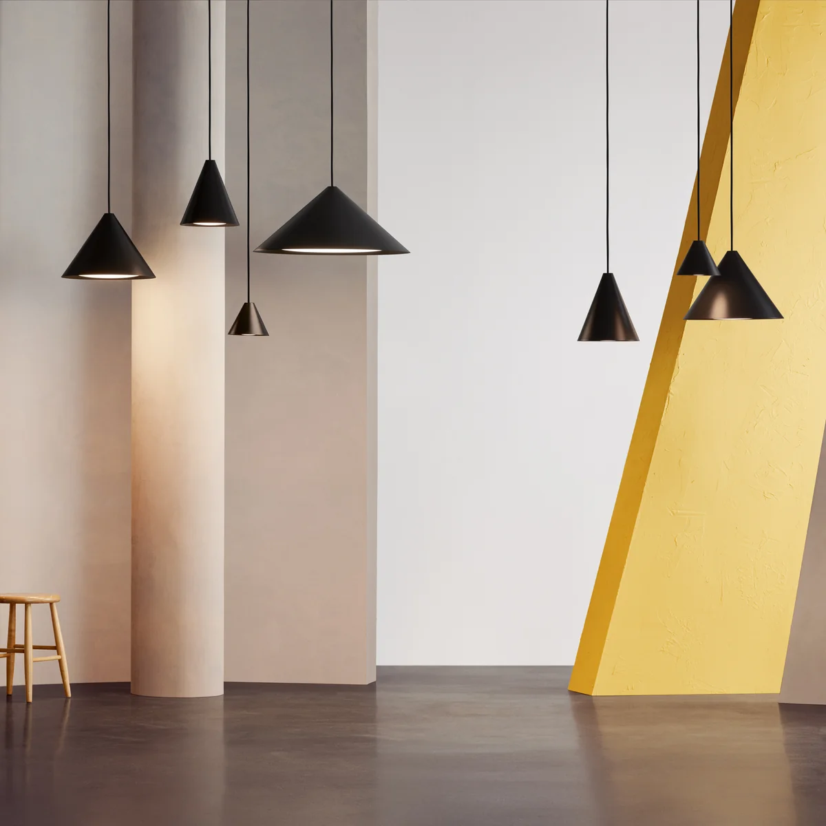Ziel von Keglen war es eine zeitlose und funktionelle Leuchtenserie zu schaffen, die sich gleichermaßen gut in private und öffentliche Räume einfügt. Dabei sollte die Lichtqualität unabhängig von der Größe der Leuchte und der Form des Kegels stets gleichbleiben. Die geometrischen und metallischen Farbtöne verfügen über einen weichen, organischen Opaleinsatz, der einem Wassertropfen ähnelt.
