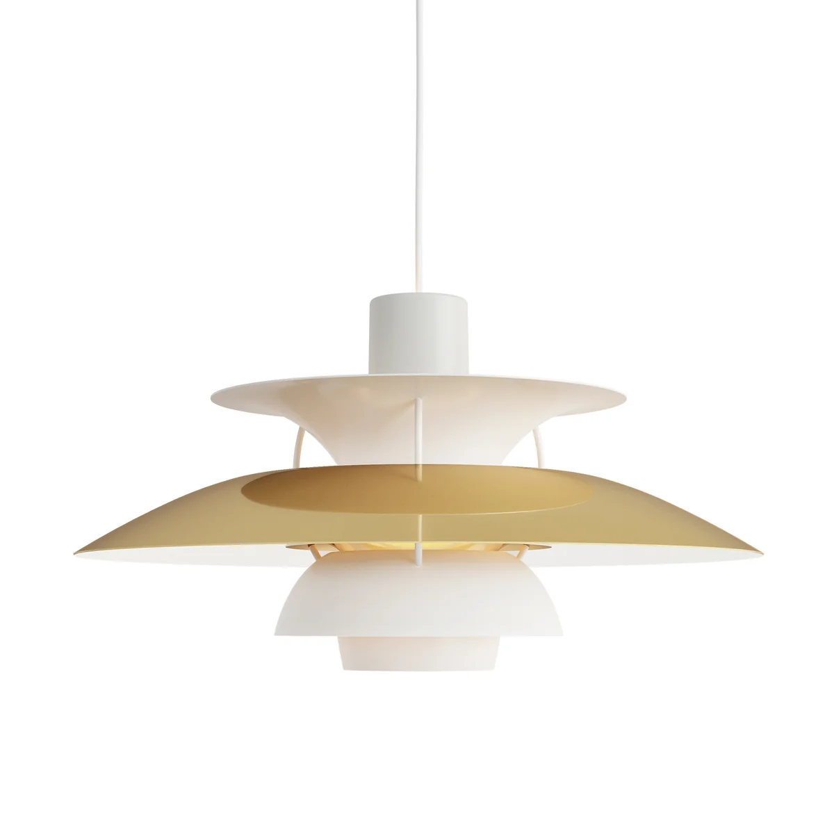 Die PH 5 und ihre jüngeren Geschwister, die PH 50 Leuchten, können tief über den Tisch gehängt werden. Sie setzen sich aus drei Schirmen und einem Kegel auf drei Streben zusammen. Zwei weitere kleinere Schirme verbessern den Spektralanteil des für das Auge kaum wahrnehmbaren Lichts. Durch das Design des sichtbaren Reflektors wird sichergestellt, dass das Licht sowohl vertikal als auch horizontal abgestrahlt wird. Durch ein sandgestrahltes Glas im unteren Schirm ist das Licht diffus.