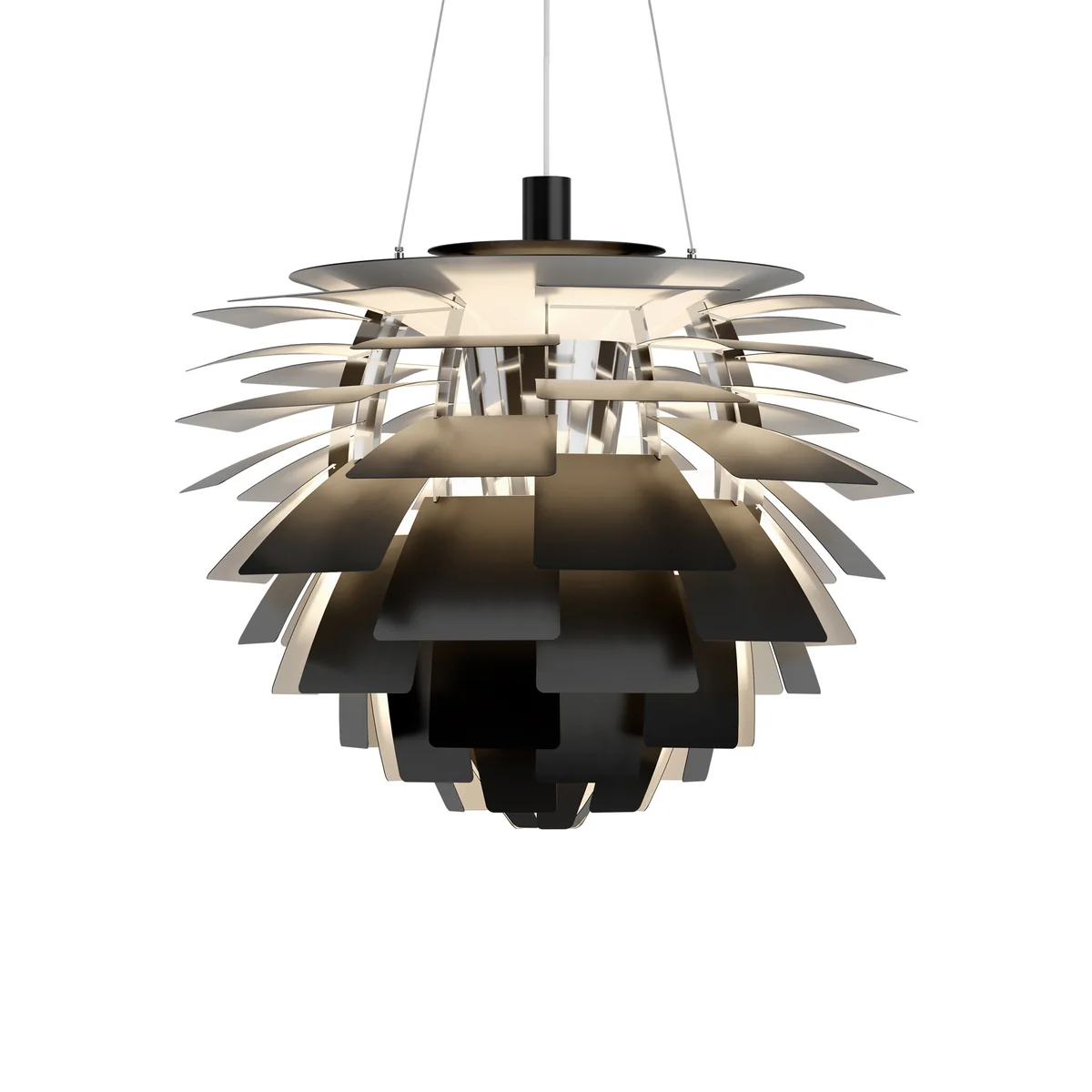 Da jede Reihe zur vorigen verschoben ist, können alle 72 Blätter „einander abdecken“ und erzeugen so eine Rundum-Blendfrei-Leuchte, deren Lichtquelle aus jeder Perspektive verdeckt bleibt. Das Licht wird auf die darunter liegenden Blätter weitergeleitet und reflektiert und erzeugt so eine ausgeprägte, einzigartige Beleuchtung. Die ersten Artichoken wurden für ein Restaurant in Kopenhagen namens Langelinie Pavilion entwickelt – und dort hängen sie auch noch heute.