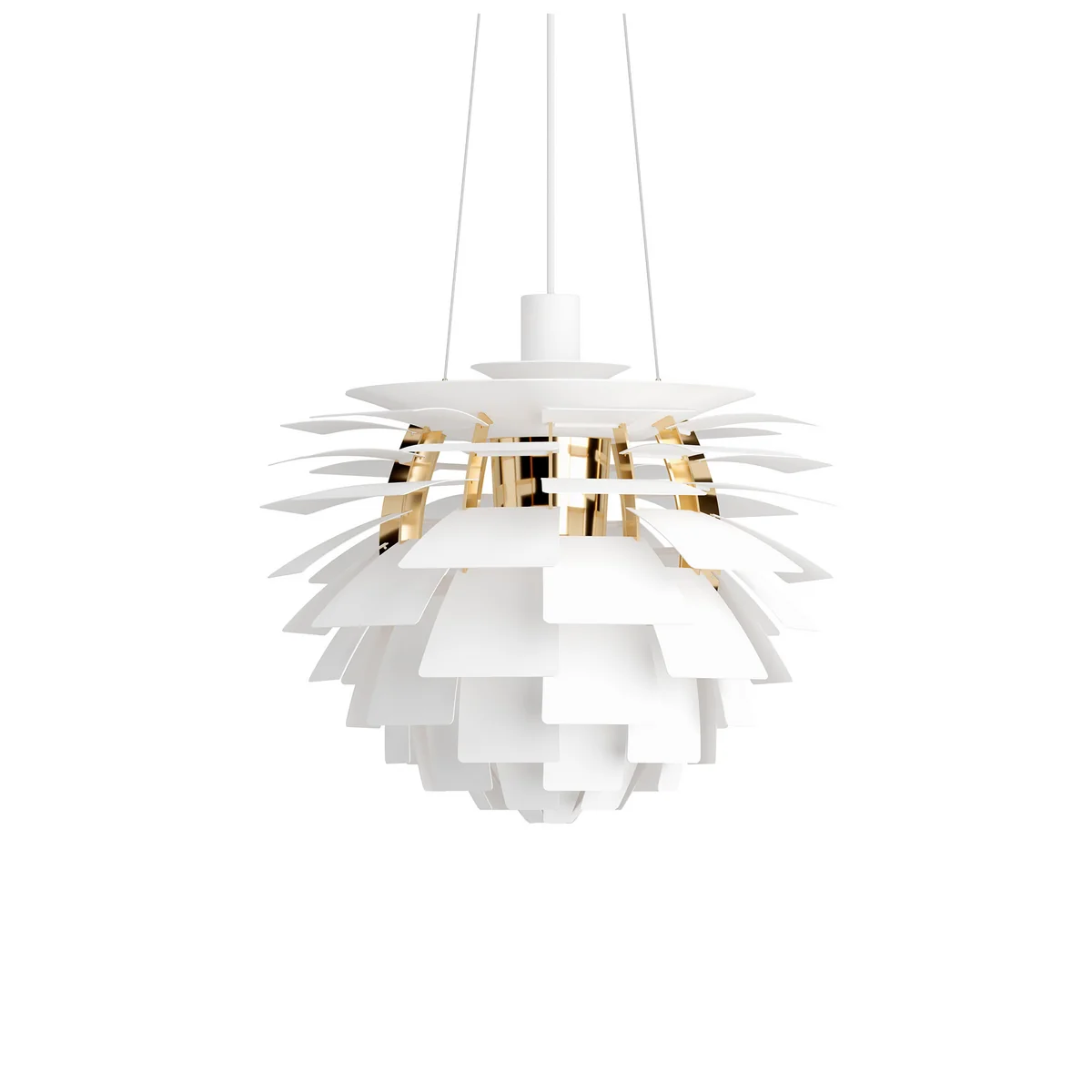 Nahezu ebenso populär und ohne Zweifel genauso stilsicher wie Henningsens bekanntestes Werk, die PH Pendelleuchte, zeigt sich die Artichoke mit seiner Struktur aus zwölf Stahlbögen. Darauf sind 72 Blätter in zwölf kreisförmigen Reihen mit jeweils sechs Blättern platziert, die in Kombination an die Form eines Zapfens erinnern.