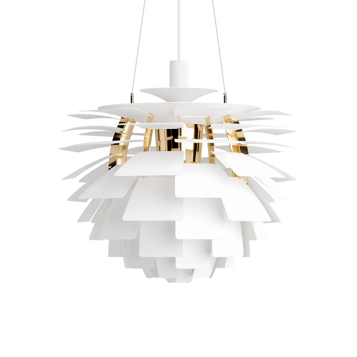 Nahezu ebenso populär und ohne Zweifel genauso stilsicher wie Henningsens bekanntestes Werk, die PH Pendelleuchte, zeigt sich die Artichoke mit seiner Struktur aus zwölf Stahlbögen. Darauf sind 72 Blätter in zwölf kreisförmigen Reihen mit jeweils sechs Blättern platziert, die in Kombination an die Form eines Zapfens erinnern.