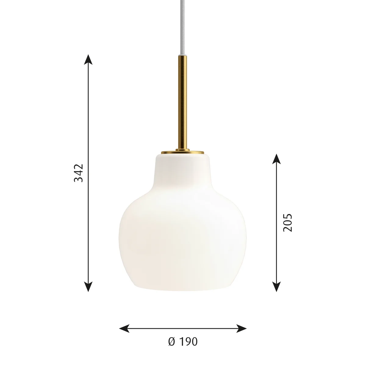 Der Schirm der Pendelleuchte wird aus glänzend weißem, dreischichtigem und mundgeblasenem Opalglas hergestellt. Die Aufhängung besteht aus unbehandeltem, poliertem Messing. Die Leuchte ist Teil einer Serie, die Lauritzen für das dänische Rundfunkgebäude in Kopenhagen entworfen hat. Die Pendelleuchte sorgt für blendfreies Licht in jedem Raum und wird besonders über einem Esstisch oder einer Kochinsel zum Hingucker.