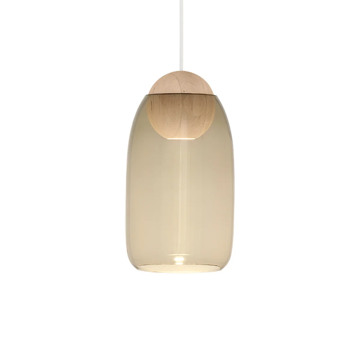 Liuku von Mater ist eine moderne Pendelleuchte von Designerin Maija Puoskari, die mit einem besonderen Materialmix begeistert. Die Leuchte besteht aus einem mundgeblasenen Glasschirm, der über einen hölzernen Leuchtenkern gestülpt wird, wodurch das Licht gedämpft und leicht gebündelt nach unten abgestrahlt wird.