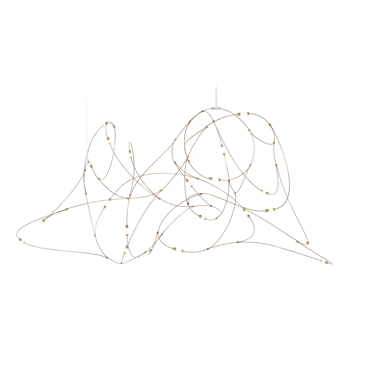 Die Flock of Light Pendelleuchte von Studio Toer verwandelt sich von einem filigranen, künstlerischen Designobjekt am Tag zu einem schwebenden Schwarm aus warmem Licht bei Nacht. Inspiriert von der Magie eines warmen Sommerabends, fängt sie die Poesie eines stillen Lichtschwarms ein.