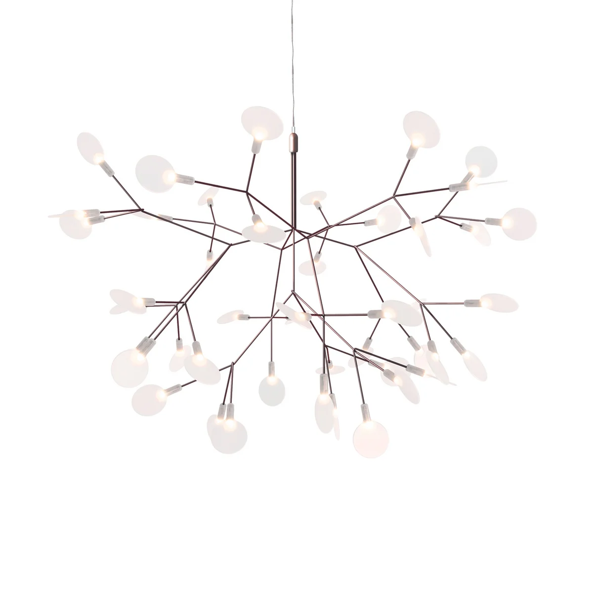 Die Stängel der filigranen Heracleum II Leuchte unterteilen sich von einem Ast aus in dünne Stränge, die eine technische und gleichzeitig organische Leuchte entstehen lassen. Die Stränge enden in einem Blatt, das gleichzeitig Diffuser für das Licht der insgesamt 45 LED-Leuchtmittel ist. Die insgesamt "Blätter" der Leuchte sind zudem beweglich, sodass sich die skulpturale Leuchte bei Bedarf justieren lässt.