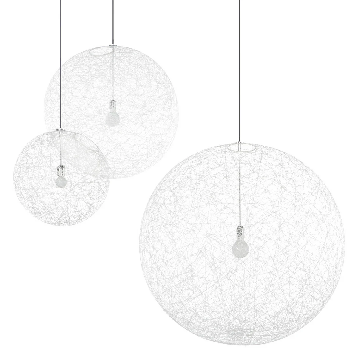Die filigran anmutende Pendelleuchte Random Light wurde 2001 von Bentjan Pot für den niederländischen Hersteller Moooi entworfen. Der Herstellungsprozess klingt denkbar einfach, denn der Leuchtenschirm besteht aus Glasfasern, die zuvor in Epoxyd-Harz getränkt, rund um einen großen Ballon gewickelt werden. Was einfach klingt, hat nach Angaben des Designers eine Entwicklungszeit von drei Jahre in Anspruch genommen.