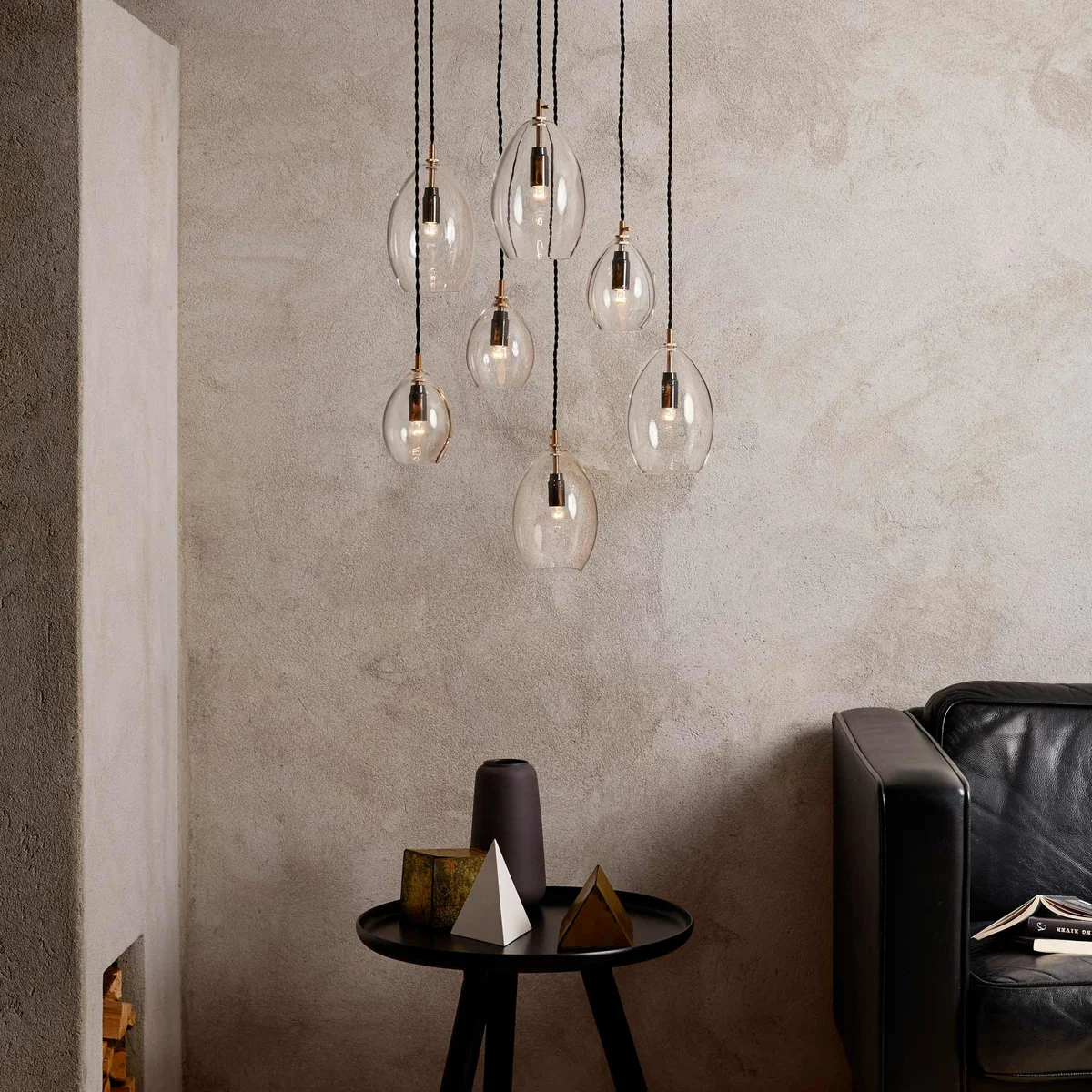 Besonderen Eindruck macht die Leuchte vor allem, wenn sie als Arrangement zu mehreren gehängt wird. Eine große und eine kleine Version erlauben dabei Variation und sorgen für ein harmonisches Ensemble. Durch das transparente Glas ist es zudem möglich eine Retroglühbirne einzusetzen, die das industrielle Design zusätzlich hervorhebt.
