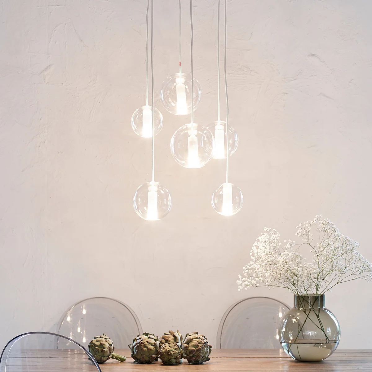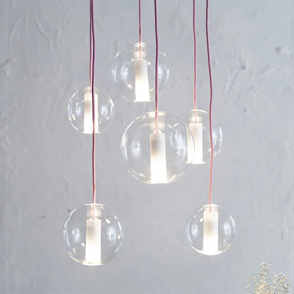 Erhältlich ist die Moon Pendelleuchte in verschiedenen Glasvarianten sowie unterschiedlichen Kabelfarben. Im Lieferumfang enthalten ist zudem ein passender Baldachin zur Anbringung an die Decke sowie das LED E14 Leuchtmittel, das sich je nach gewünschter Stimmung dimmen lässt.