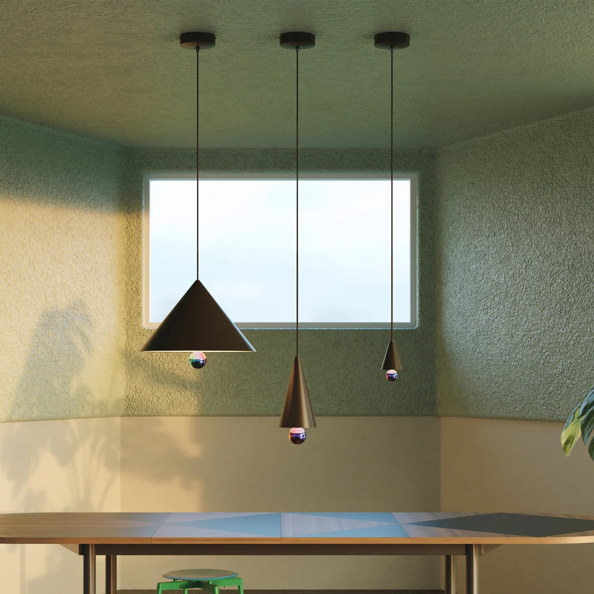 Die Cherry LED Pendelleuchte wurde vom australischen Designer-Duo Daniel und Emma für Petite Friture entworfen. Sie zeigt sich in einem minimalistischen und einfach gehaltenen Design. Die Pendelleuchte besteht aus einem Aluminium-Kegel mit einer schimmernden Kugel am Boden, die das Licht reflektiert und verstärkt. Cherry eignet sich als zusätzliche Beleuchtung im Wohnzimmer oder als ausdrucksstarke Hängelampe über dem Esstisch. In verschiedenen Größen und Farben kann die LED-Pendelleuchte miteinander kombiniert werden, sodass ein kunstvolles Lampen-Arrangement entsteht.