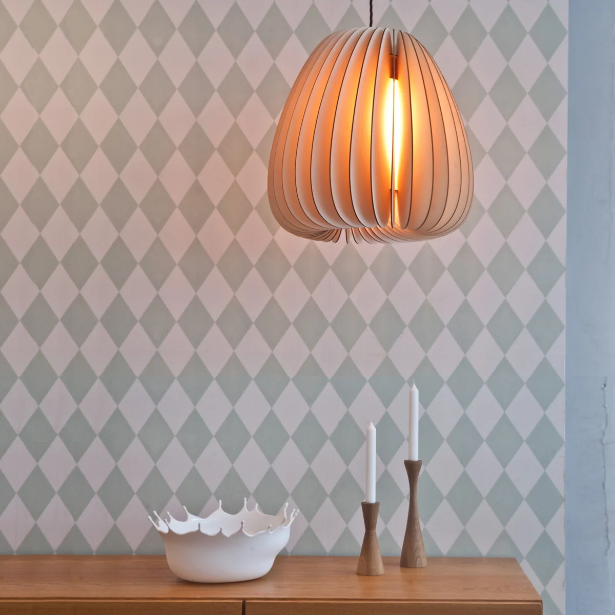Die Pendelleuchte Volum wird gerne über große Esstische, in Flurbereiche oder in Räume mit hohen Decken gehängt. Sie strahlt mittels ihrer schräg gestellten Lamellen aus Pappelholz ein angenehmes und blendfreies Licht aus.