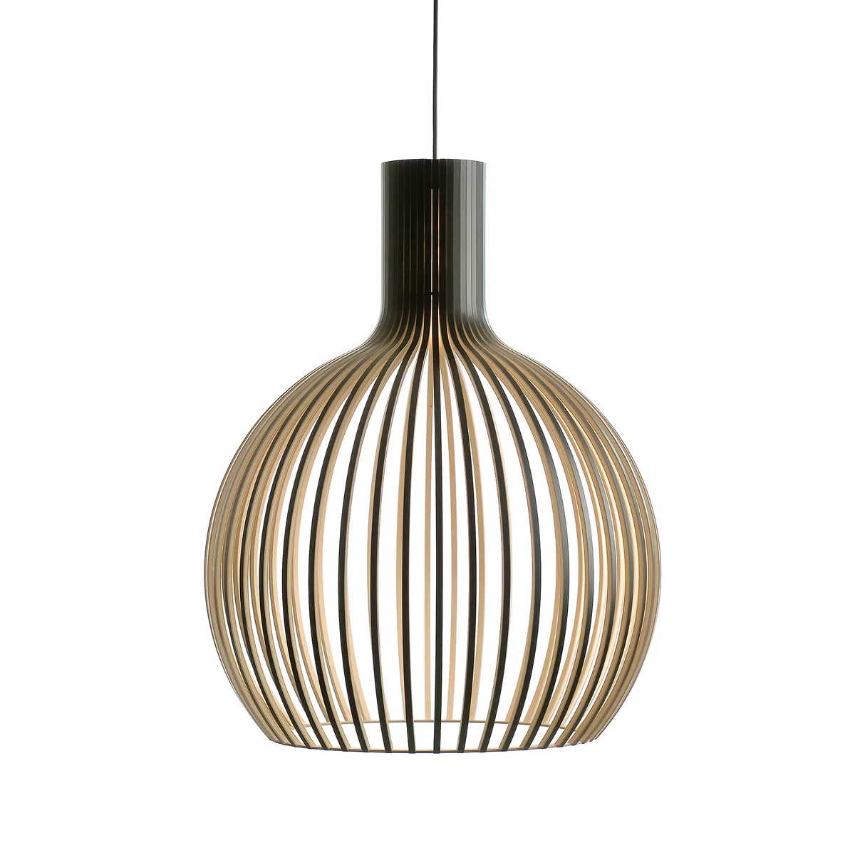 Die Leuchte wird in Handarbeit aus PEFC-zertifizierter formgepresster Birke in verschiedenen Lackierungen oder mit Walnussfurnier in Finnland von erfahrenen Handwerkern hergestellt. Sie überzeugt durch ihre bauchige Form und durch die gebogenen Holzlamellen. Die Holzlamellen lassen das Licht auf schöne Weise hindurch scheinen, wodurch eine angenehme Atmosphäre in jedem Raum entsteht.