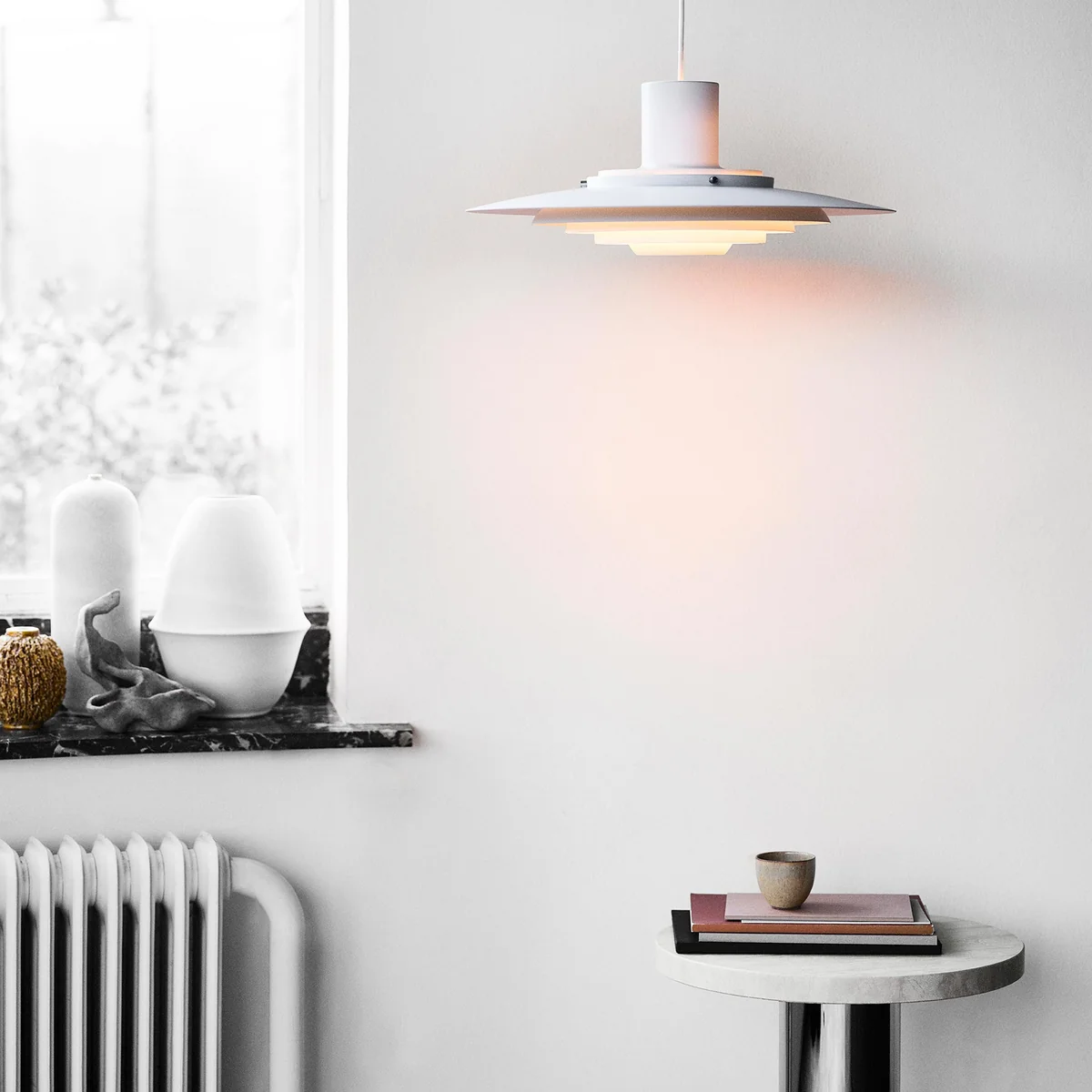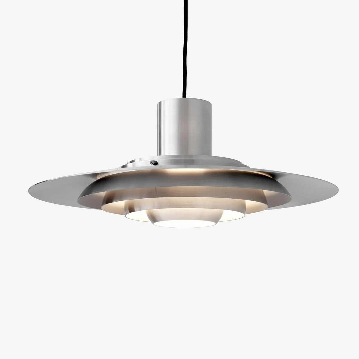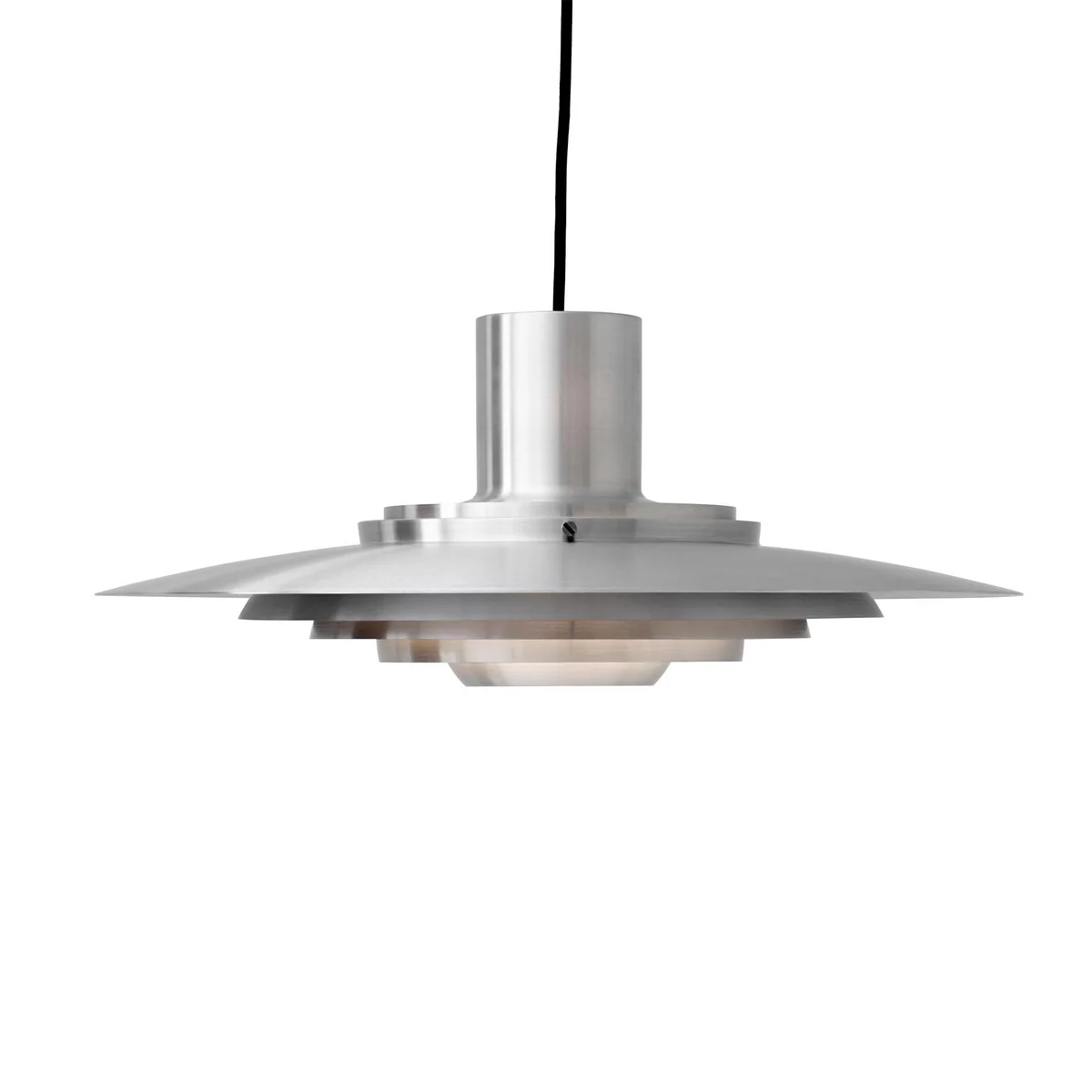 Das Design hat bis heute nichts von seinem Charme verloren und wurde nur minimal optimiert, um die Authentizität der Leuchte zu wahren. Gefertigt ist die Pendelleuchte aus fünf Aluminium-Kreisen zu einer offenen Form. Die Anordnung erfolgt dabei so, dass ein sanftes, indirektes Licht entsteht, mit dem sich Esstische oder Schreibtische bestens ausleuchten lassen.