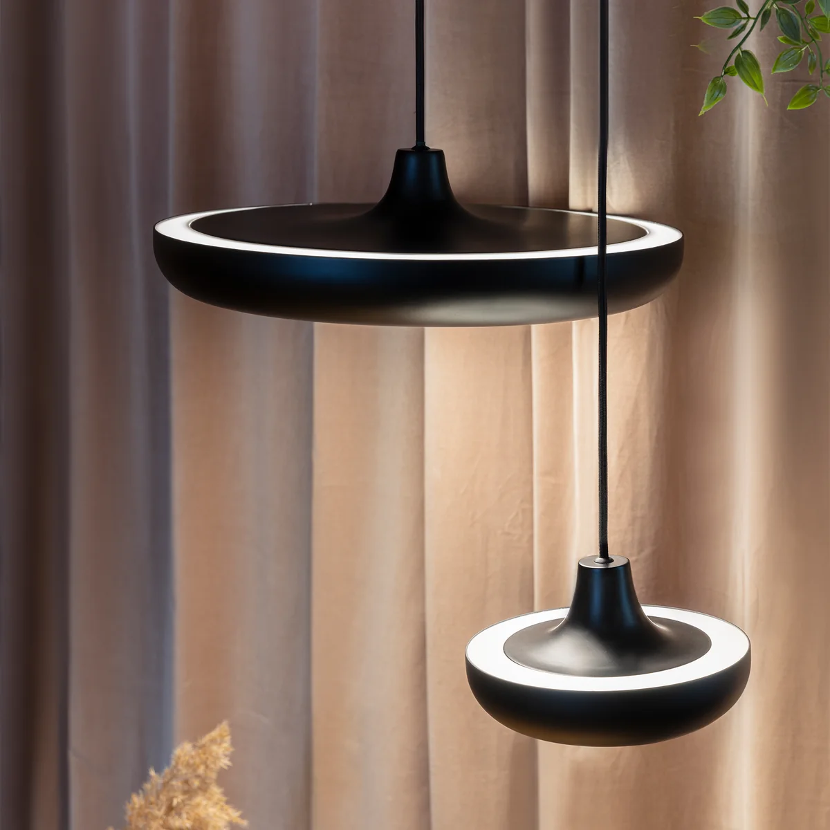 Die Cassini LED-Pendelleuchte von Umage ist eine von den Ringen des Saturn inspirierte Leuchte. Sie verfügt über ein eingebautes LED-Paneel mit weißen Diffusoren, die ein weiches, blendfreies Licht (3000K) im Raum erzeugen und eine nachhaltige Lebensdauer des Designs gewährleisten. Ein oberes Paneel sorgt sowohl nach oben als auch nach unten für Umgebungsbeleuchtung, wodurch die Details des Designs hervorgehoben und dem Raum eine weiche Atmosphäre verliehen wird. Hinter dem Entwurf steckt der dänische Designer Jacob Rudbeck.
