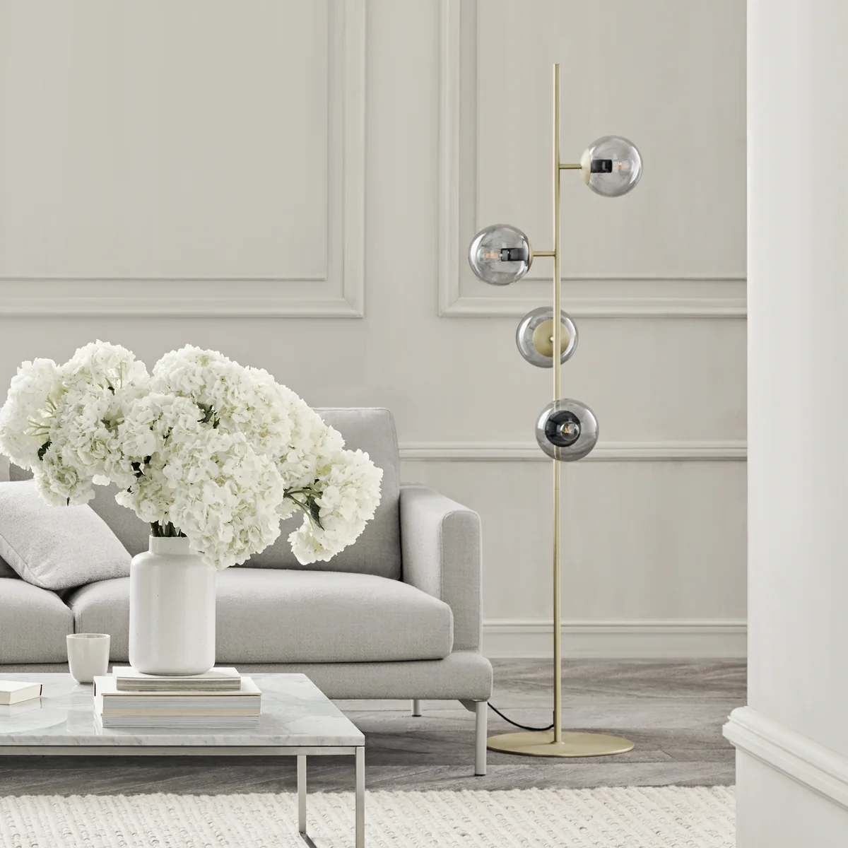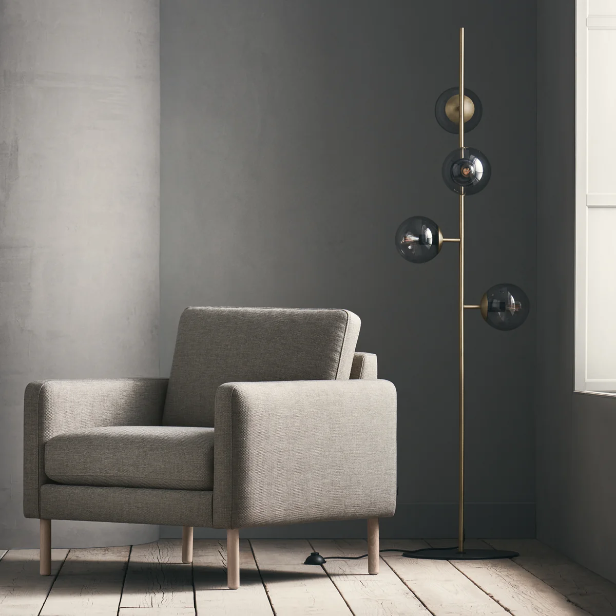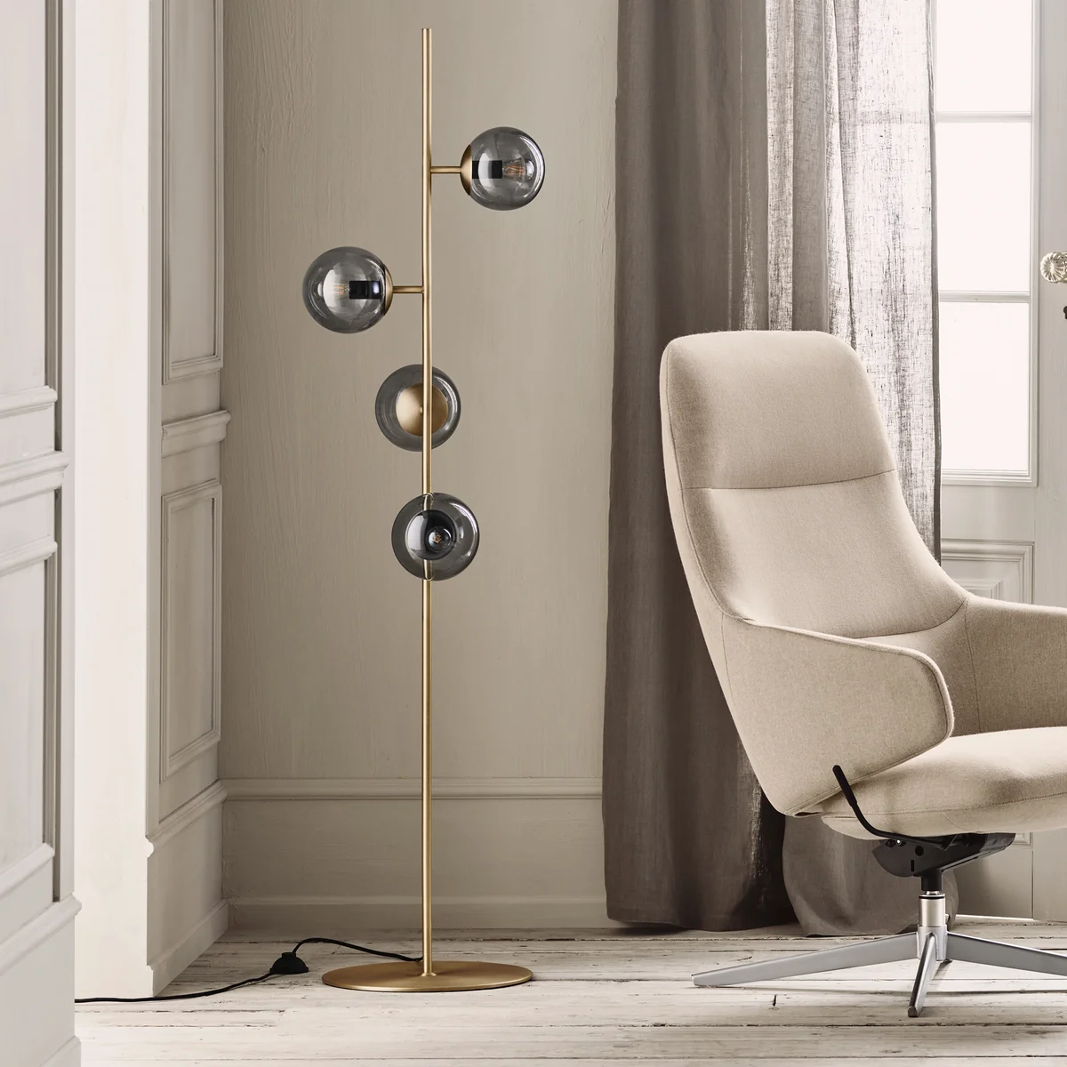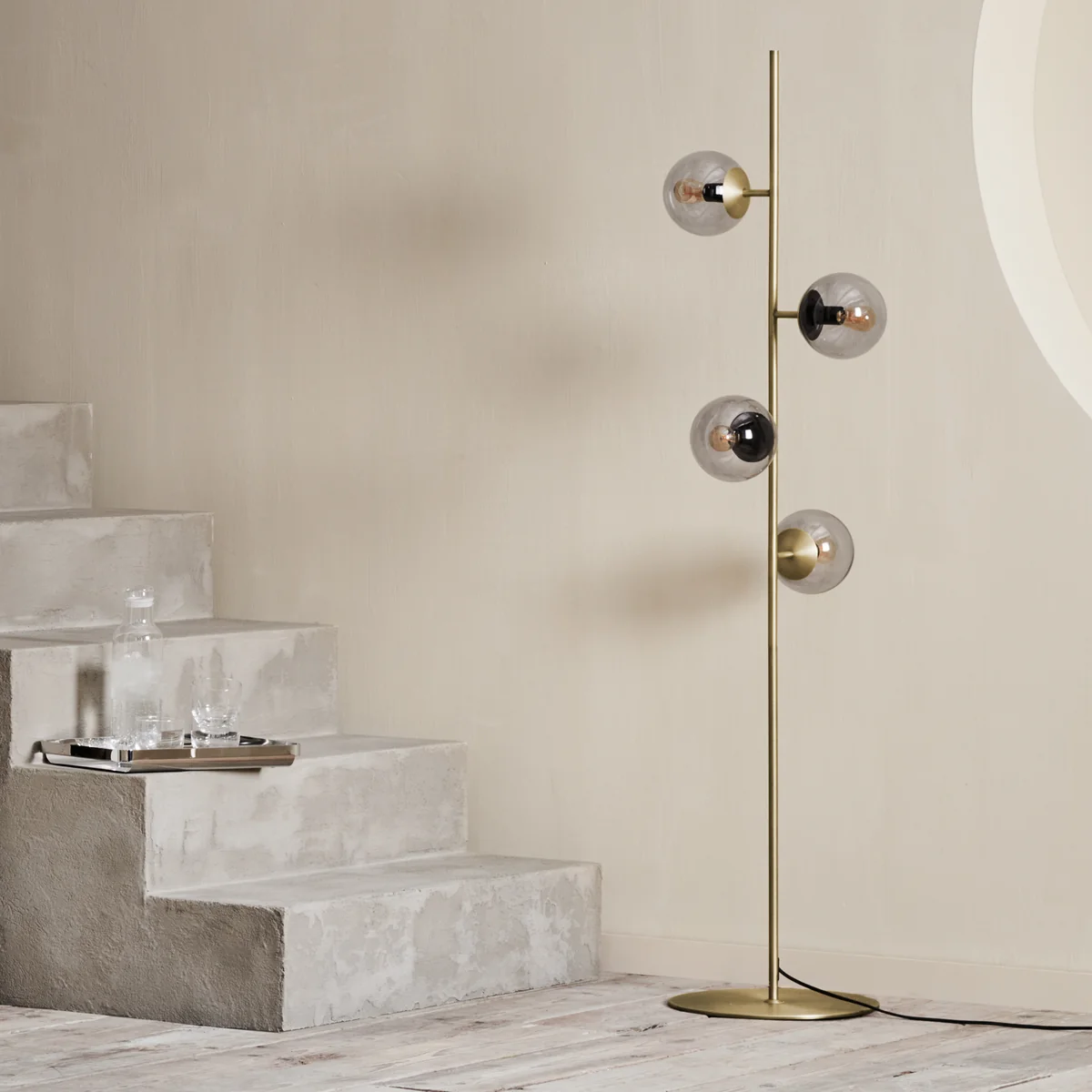 Ein visuelles Vergnügen bietet die Orb Stehleuchte von Bolia, die das ultimative Industriedesign aus Messing und Glas verkörpert. Sie verbindet auf äußerst gelungene Weise die raue Ästhetik mit einem äußerst eleganten Ausdruck. Diese beeindruckende Stehleuchte zieht die Blicke auf sich und verleiht dem Zuhause unabhängig davon, ob sie im Wohnzimmer, im Flur oder vielleicht sogar im begehbaren Kleiderschrank platziert wird, jede Menge Charakter.