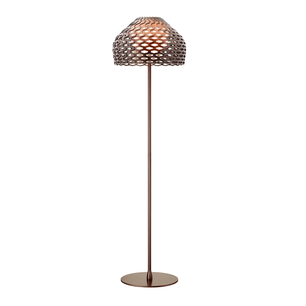 Bei der Tatou Stehleuchte von Flos hat sich Designerin Patricia Urquiola von japanischen Rüstungen inspirieren lassen. So erinnert der wabenartige Lampenschirm an einen Schutzschild, wie ihn beispielsweise ein Gürteltier, auf Französisch „tatou“, trägt.