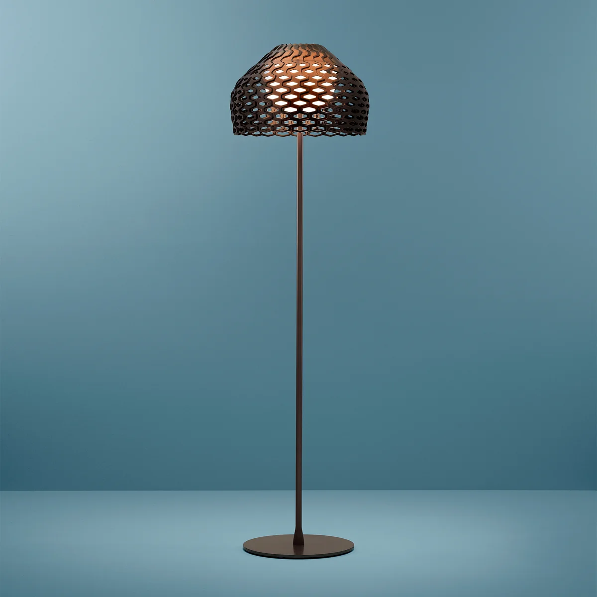Die Tatou Stehleuchte von Flos besteht aus einem perforierten Polycarbonat-Schirm und einem lackierten Stahlgestell. Sie ist in verschiedenen Farben erhältlich.