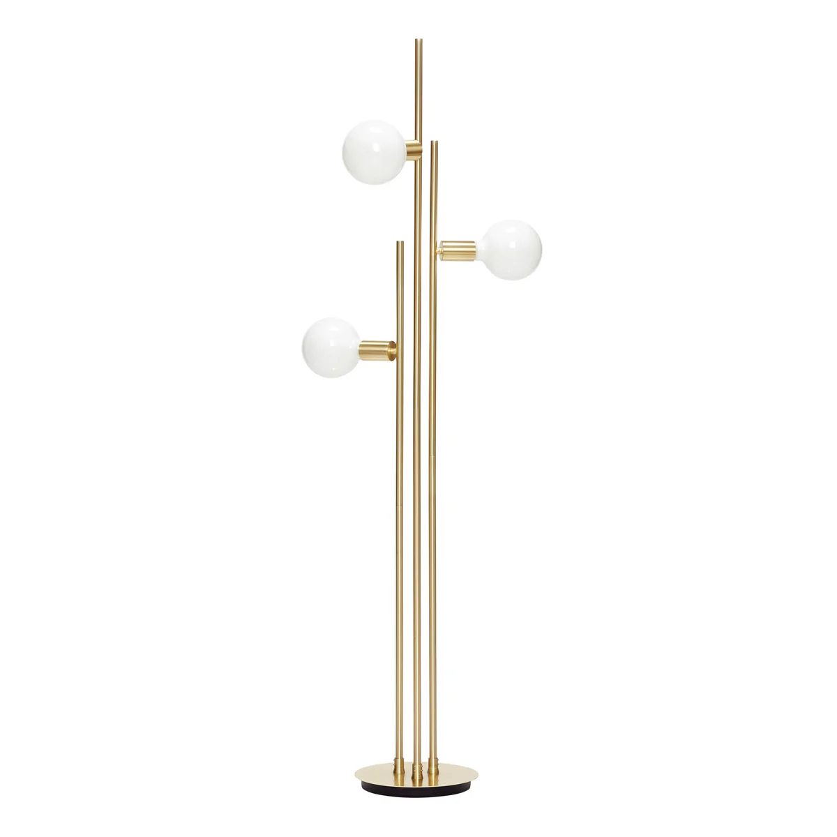 Die 3-flammige Stehleuchte von Hübsch Interior ist eine schlichte und stilvolle Leuchte, die sich mit ihrer klassischen und zeitlosen Form ideal nicht nur im Wohnzimmer platzieren lässt. Drei schlanke Streben aus Messing enden jeweils in verschiedenen Höhen und beheimaten drei runde, minimalistische Lampen, die im rechten Winkel angebracht sind.