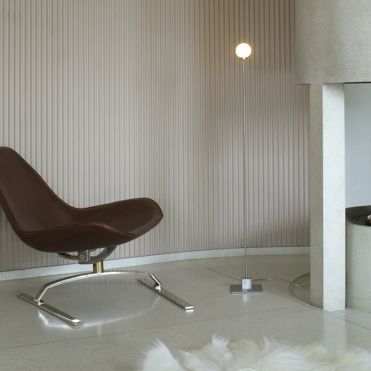 Die minimalistische Gestaltung des runden Lampenschirms aus Glas ist kennzeichnend und verschafft der Leuchte ihren Namen. Durch das mattweiße Glas wird das Licht diffus gestreut und sorgt so für eine angenehme, blendfreie Beleuchtung des Raumes. Der runde Lampenschirm thront auf einem filigranen Stahl-Gestell, das in einen würfelförmigen Sockel fußt. Die Kombination aus runden und kantigen Formen sorgt für einen spannungsreichen Kontrast und macht die Leuchte zu einem besonderen Blickfang.