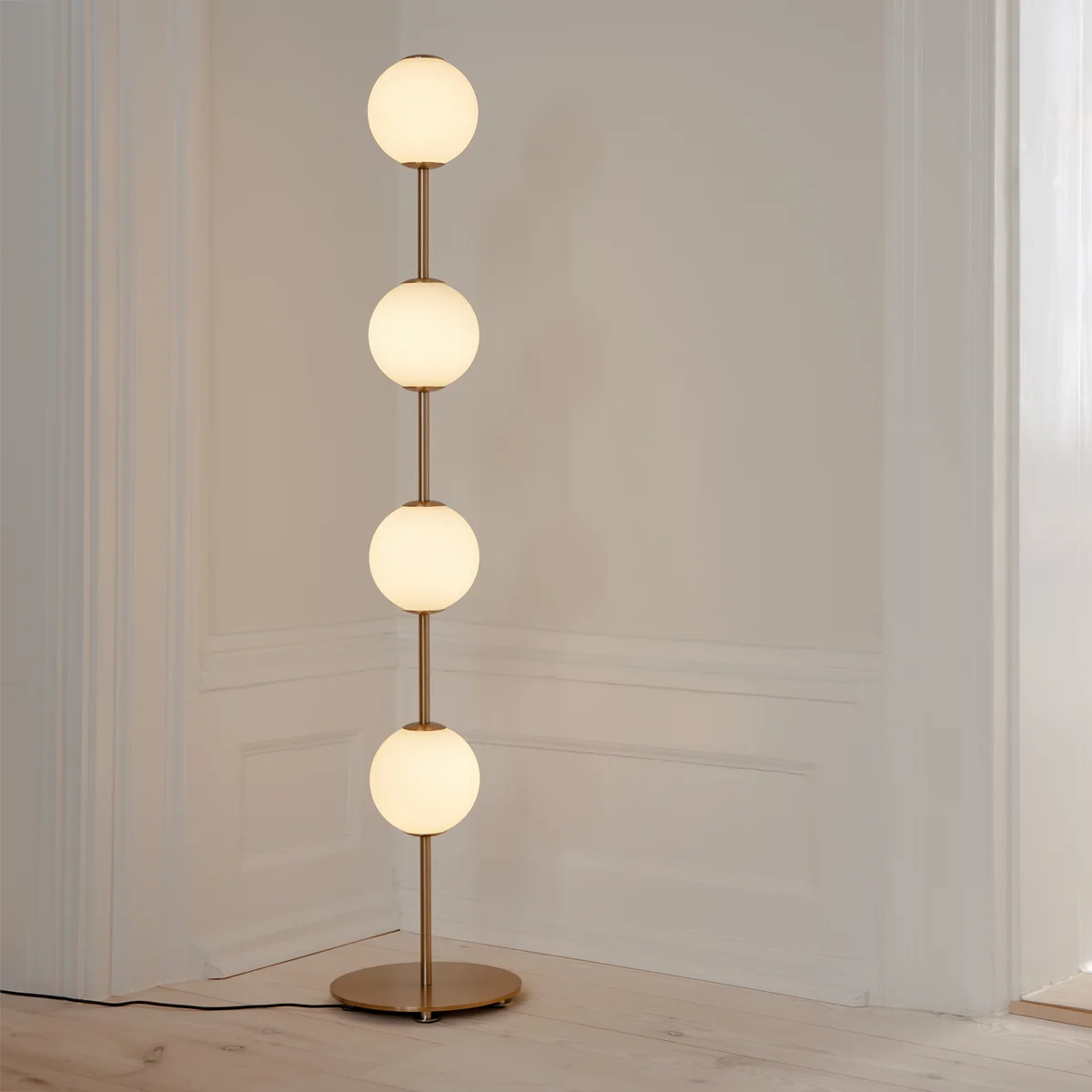 Die Kollektion zeichnet sich durch ihre atemberaubenden Messingakzente und mundgeblasenen Opalglaskugeln aus, die an leuchtende Perlen erinnern. Diese zarten Kugeln verbreiten sanft das Licht und schaffen eine beruhigende Atmosphäre, die zu Entspannung und Ruhe einlädt.