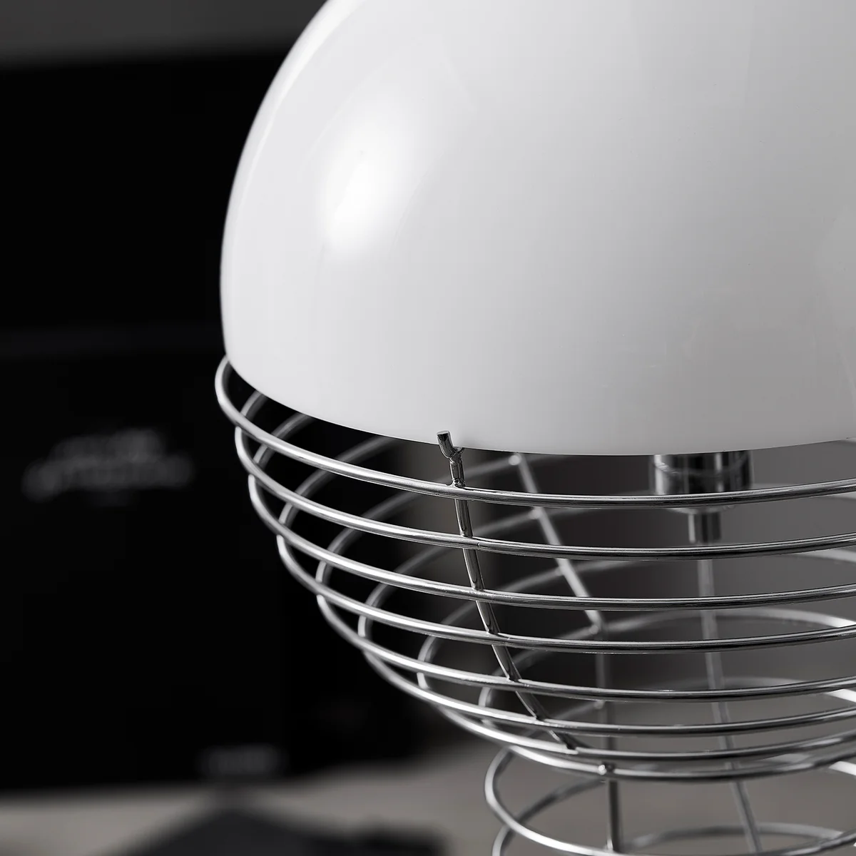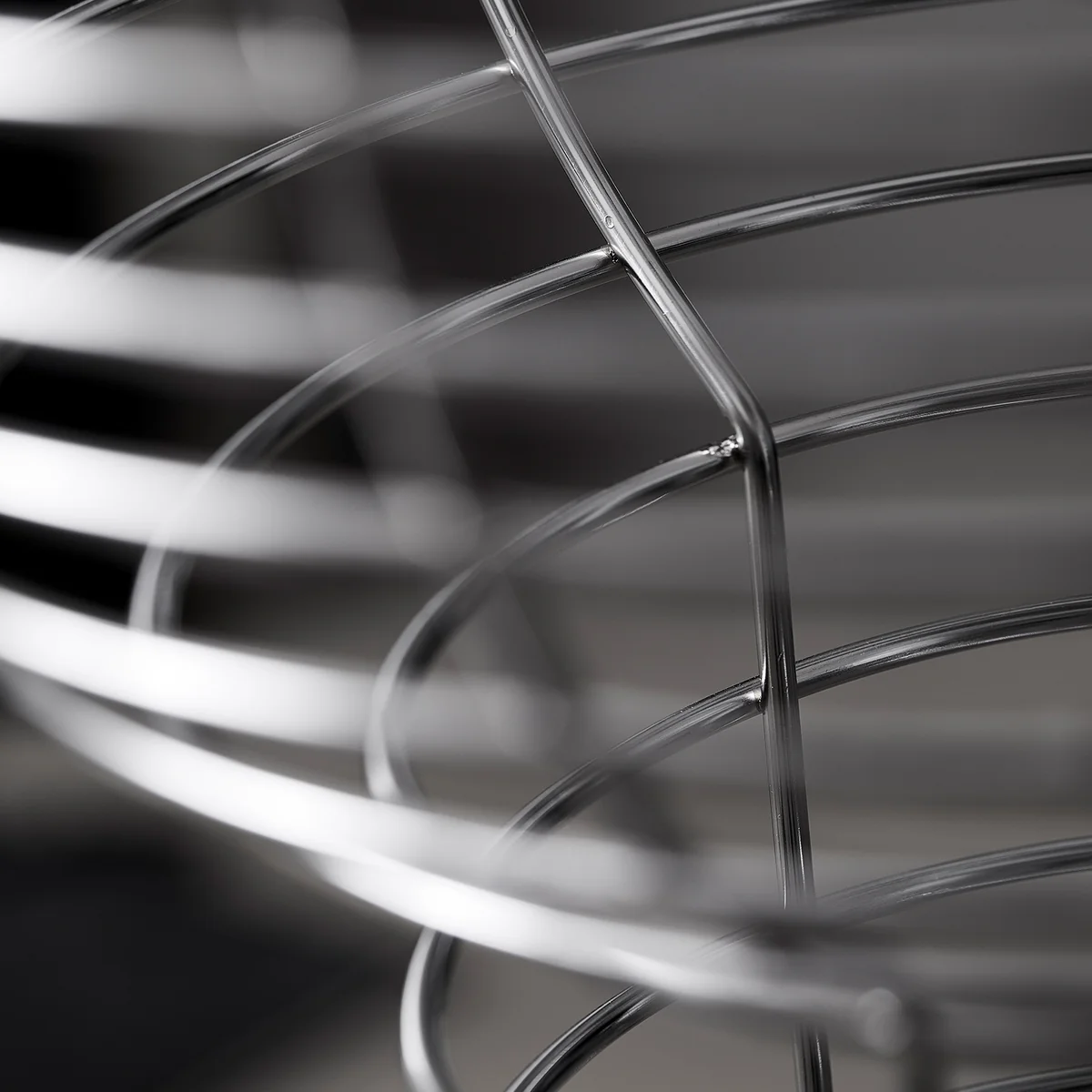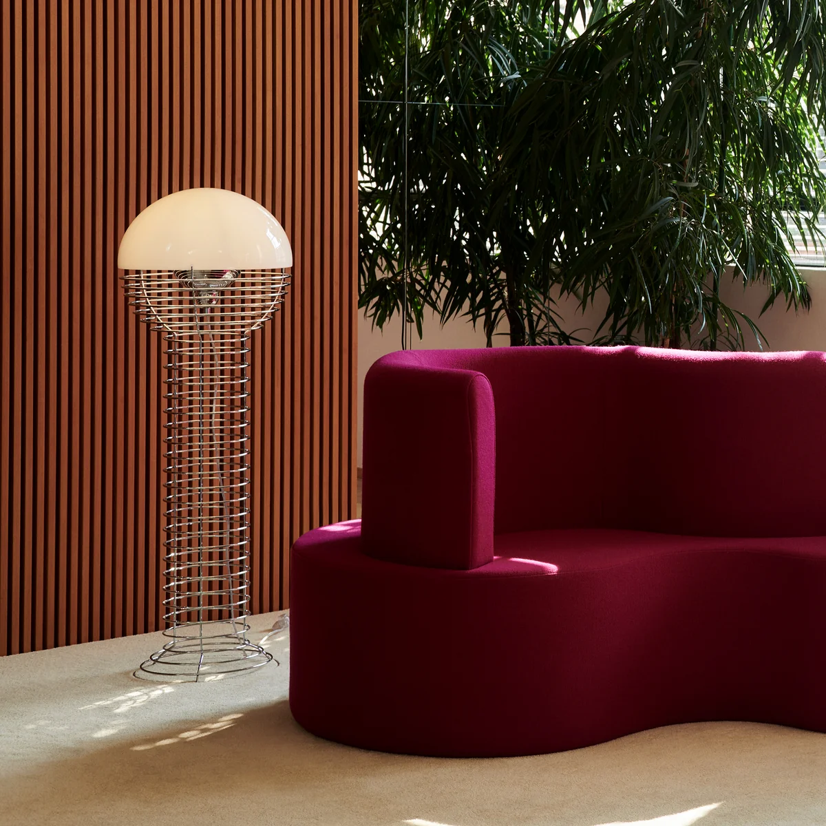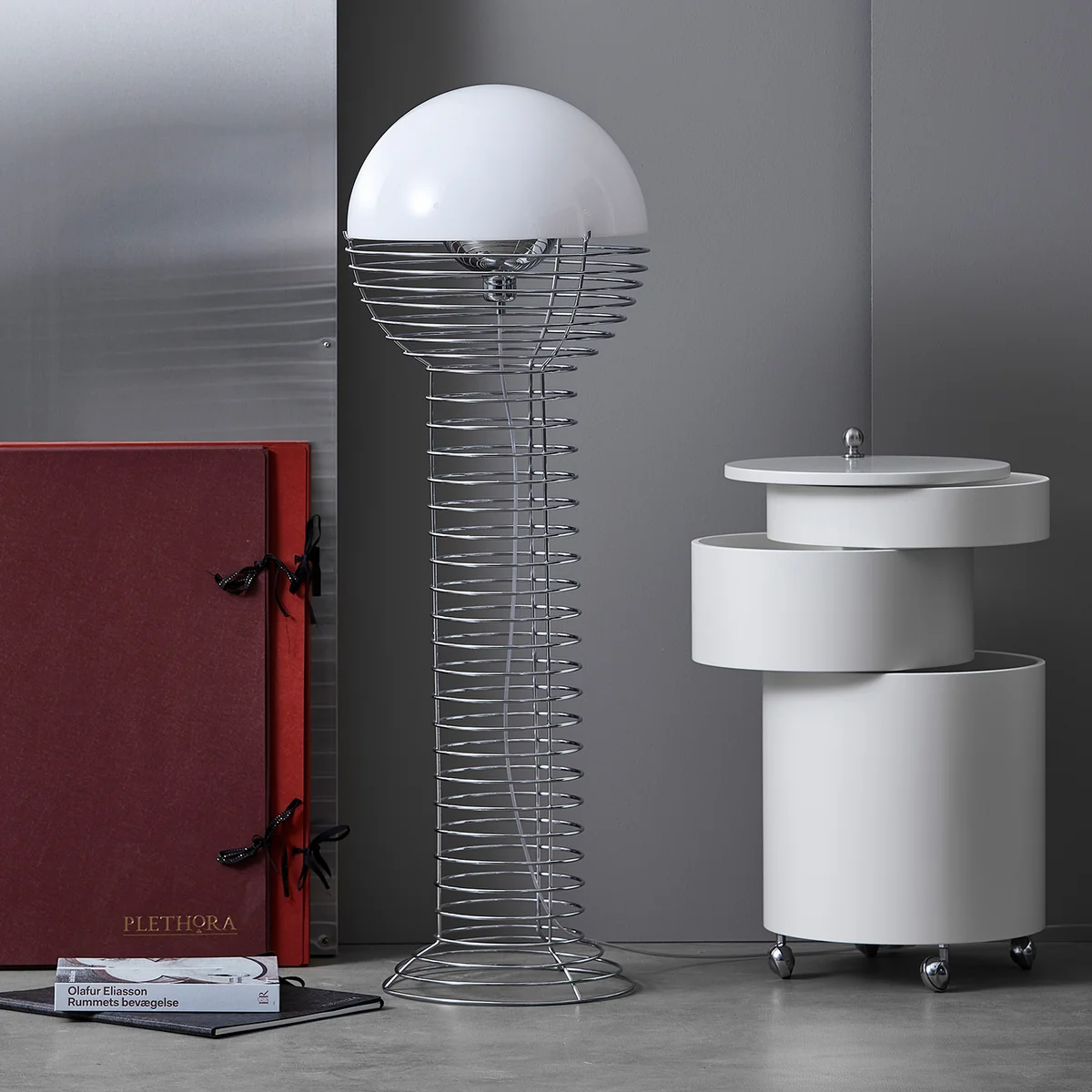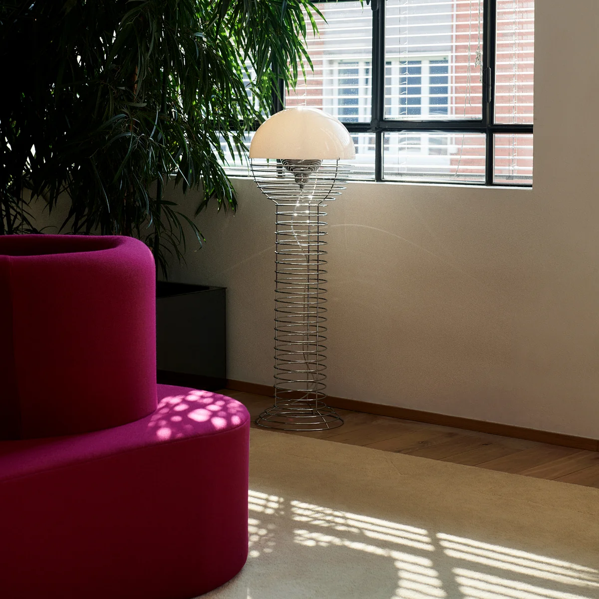 Die Wire Stehleuchte von Verpan ist ein Entwurf des dänischen Designers Verner Panton aus dem Jahr 1972. Die Leuchte besitzt ein gewundenes Stahldrahtgestell, das an eine Sprungfeder erinnert und dadurch luftig-leicht wirkt. Das Gestell mündet in einem halbkugelförmigen Schirm aus Kunststoff unter dem ein Metallreflektor verborgen ist. So gibt die Leuchte ein sanftes, diffuses Licht ab, das den Raum in eine gemütliche Atmosphäre taucht.