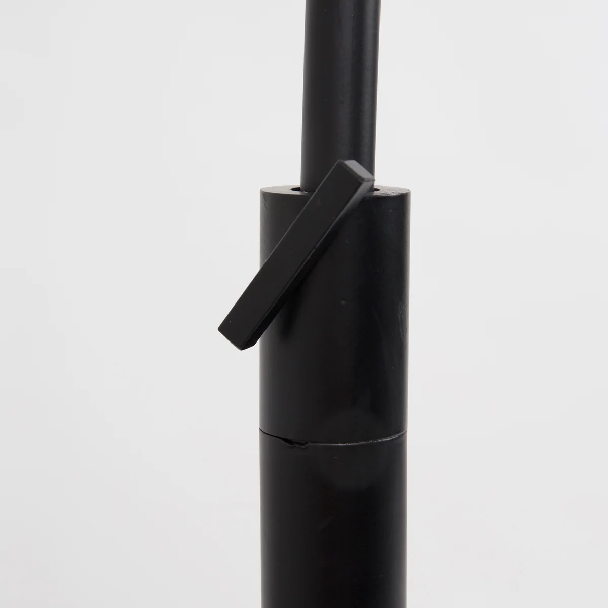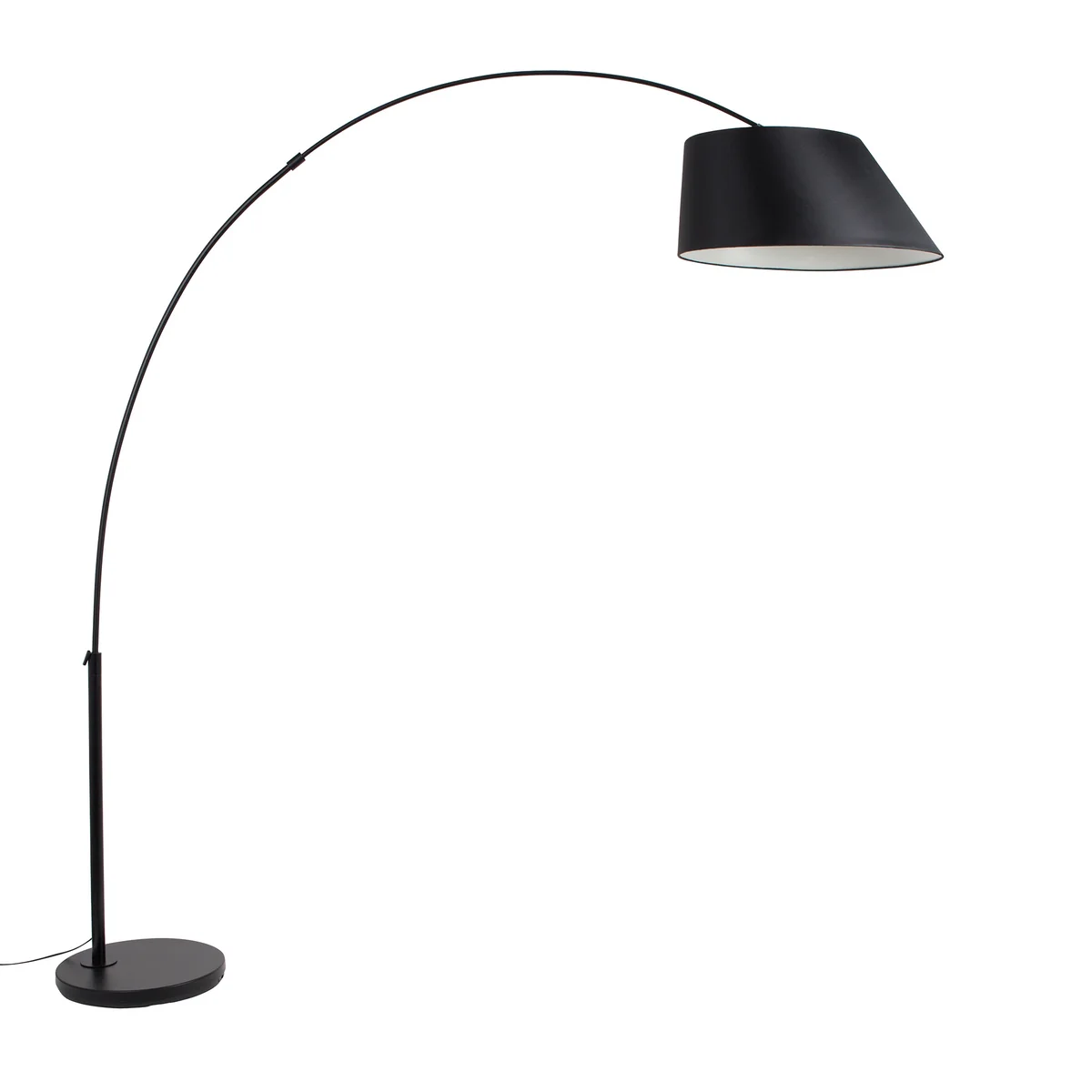 Der große Stoffschirm sorgt für ein angenehm diffuses Licht, das den Raum weich und gleichmäßig ausleuchtet. In Kombination mit dem schwarzen Metallgestell entsteht ein elegantes Gesamtbild, das sowohl moderne als auch klassische Räume stilvoll ergänzt.