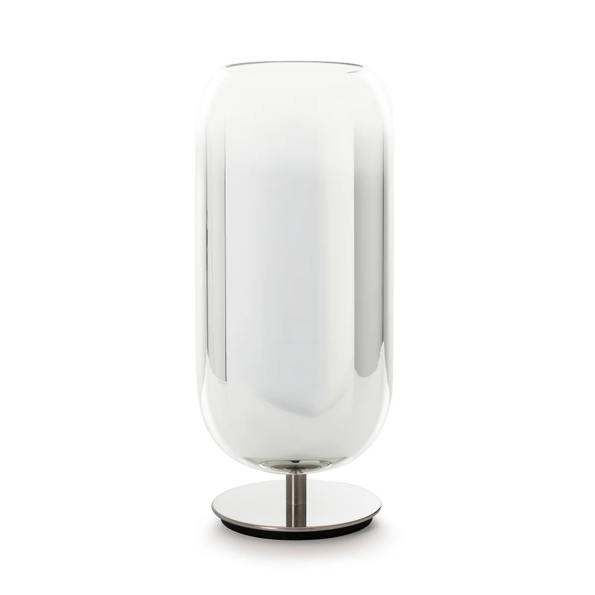 Die Gople Tischleuchte von Artemide fasziniert durch einen wunderschönen Farbverlauf und ihre fließenden Formen. Das aus Glas hergestellte Designobjekt spendet diffuses, angenehmes Licht im Schlafzimmer oder Wohnzimmer und dient gleichzeitig als dekorativer Blickfang auf Nachttischen oder Couchtischen. Nach einer alten, venezianischen Tradition wurde diese Leuchte aus weißem Glas und Kristallglas mundgeblasen, sodass jedes Exemplar einzigartig ist. Den finalen, glänzenden Touch erhält die Tischleuchte durch eine innovative Vakuummetallisierung.