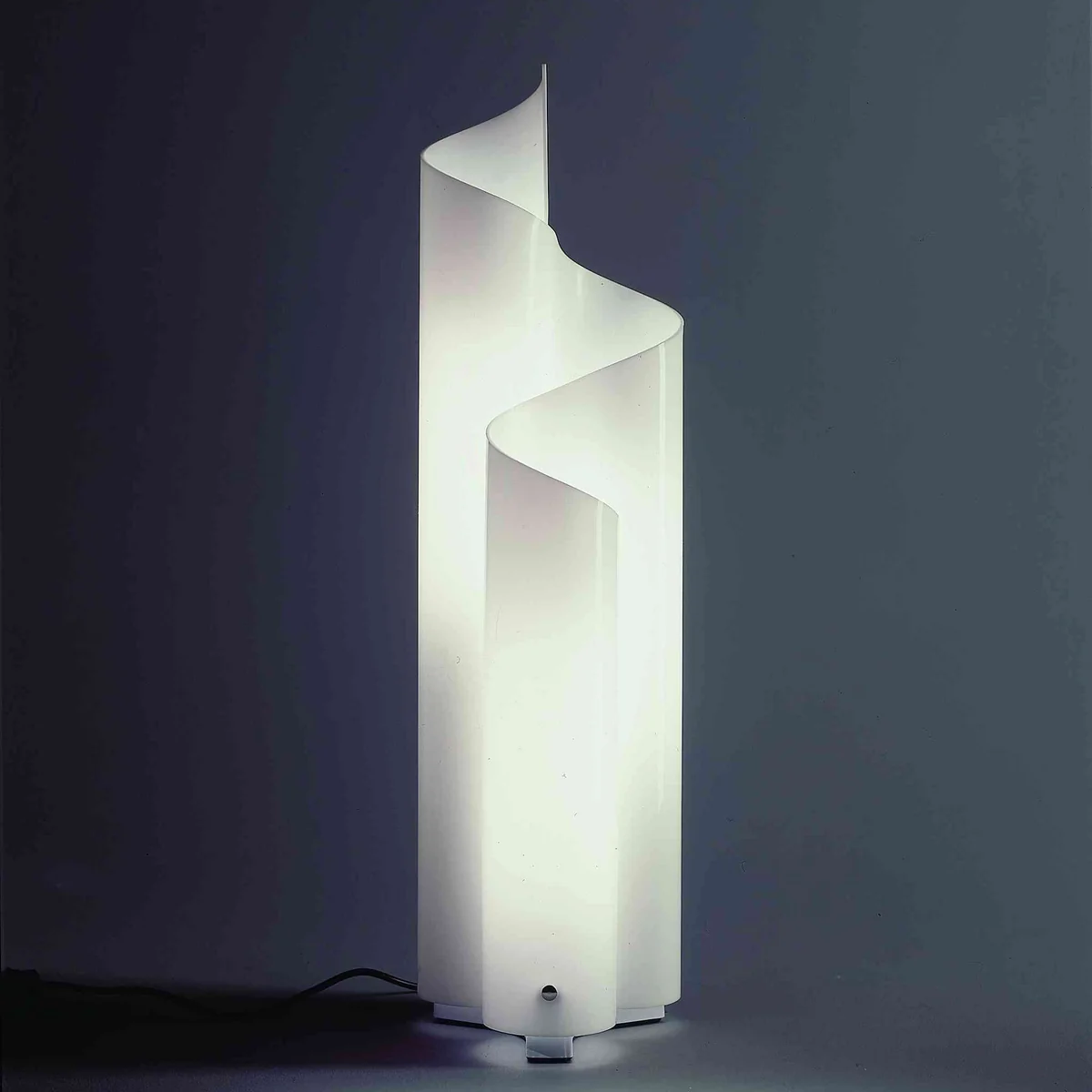 Der lichtdurchlässige Körper von Artemides Mezzachimera besteht aus Metacrylat. Die gewellte Form der Leuchte wird erreicht, indem das Material während des Herstellungsprozesses heiß gebogen wird. Der Sockel besteht aus lackiertem Metall.