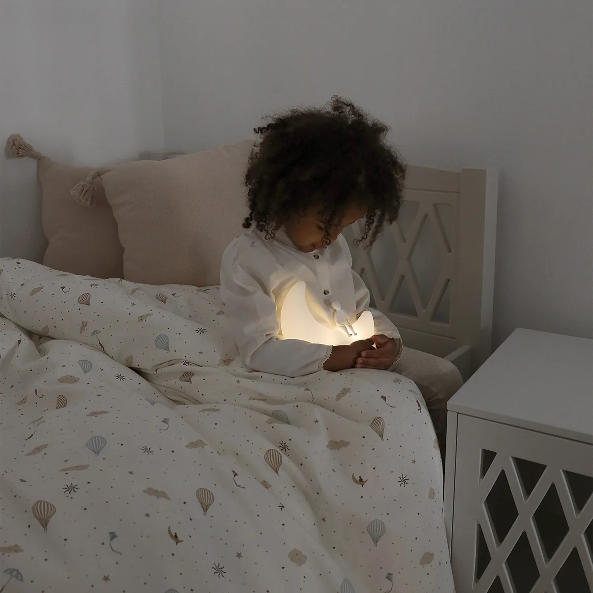 Die Moon Akku-Tischleuchte des dänischen Herstellers Cam Cam Copenhagen begeistert mit seiner außergewöhnlichen Optik. Das Nachtlicht sorgt mit seinem warmen, sanften, seichten Licht für eine verträumte Atmosphäre im Kinderzimmer. Moon kann wunderbar auf dem Nachttisch neben dem Bett oder auf dem Wickeltisch platziert werden. Die Leuchte lässt sich einschalten, indem der Knopf unterhalb der Lampe gedrückt wird. Durch sanftes Antippen wechselt die Akku-Tischleuchte ihre Farben. Durch nochmaliges Tippen leuchte die aktuelle Farbe weiter, ohne zu wechseln.