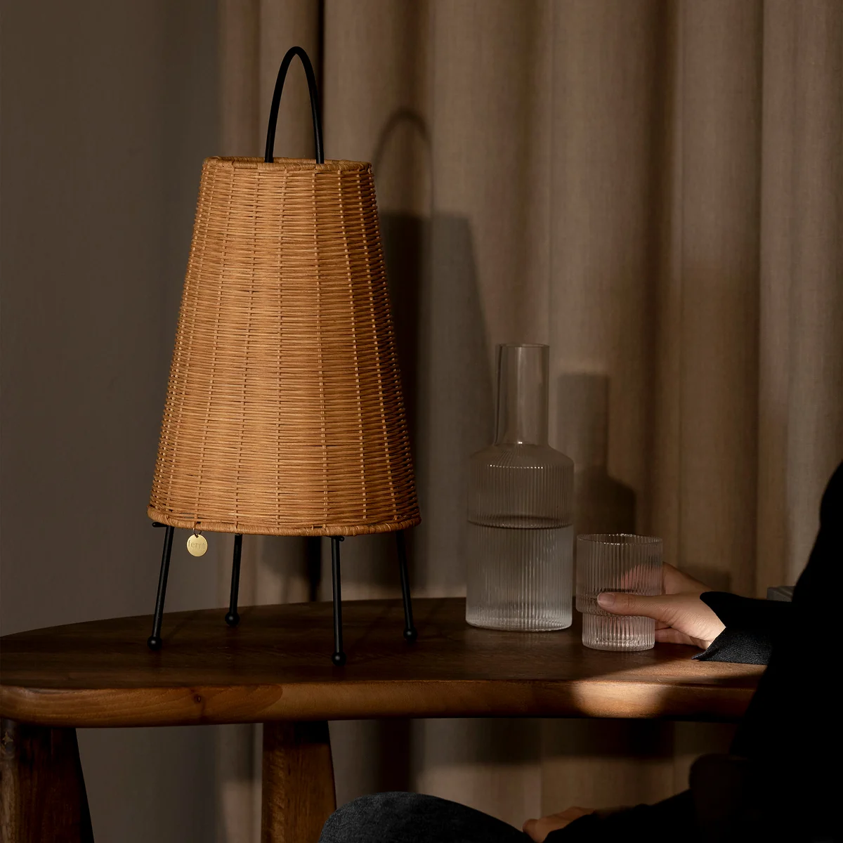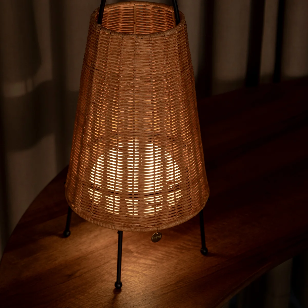 Die Porti LED Tischleuchte Rattan von Ferm Living ist eine moderne Interpretation der klassischen Laterne. Die tragbare Leuchte kann vielseitig platziert werden und wird aus geflochtenem Ratten mit pulverbeschichtetem Eisenfuß und einer LED-Kuppel gefertigt. Porti bietet sanftes, warmes Licht, welches für gemütliche Wohlfühlmomente sorgt. Dank der Hover-Touch-Funktion des Leuchtenfußes kann die Lichtintensität durch simples Berühren angepasst werden. Ebenfalls kann das Antippen die LED-Leuchte sowohl ein- als auch ausschalten. Porti kann zudem sogar dank der verstellbaren Füße auf unebenen Oberflächen aufgestellt werden.