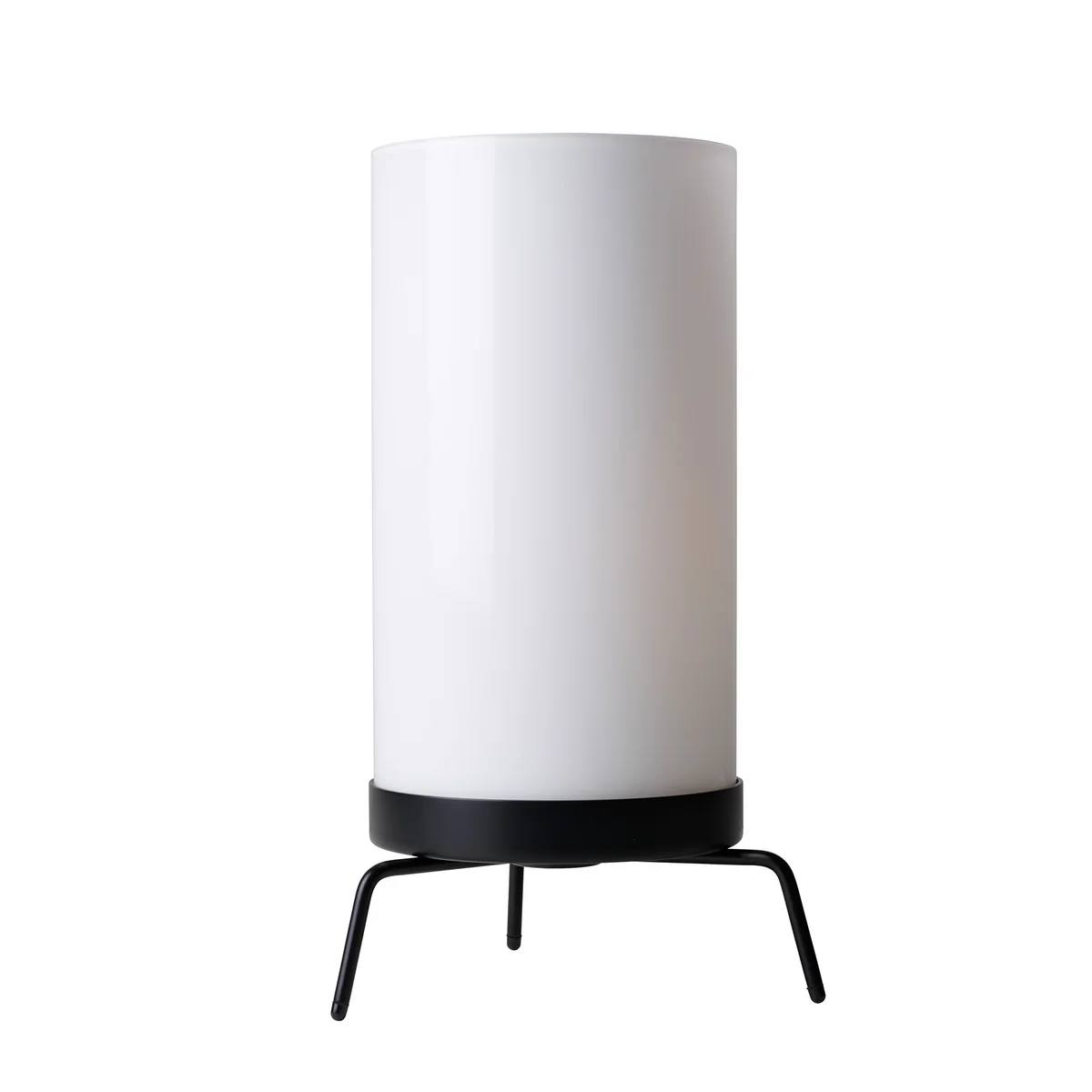 Die Leuchte besteht aus einem mundgeblasenen mattierten Glasschirm, der für indirektes, stimmungsvolles und warmes Licht sorgt. Der dreibeinige Sockel wird aus pulverbeschichtetem Stahl oder glänzendem Messing hergestellt und bildet so einen eleganten Kontrast zu dem hohen, zylindrischen Schirm.