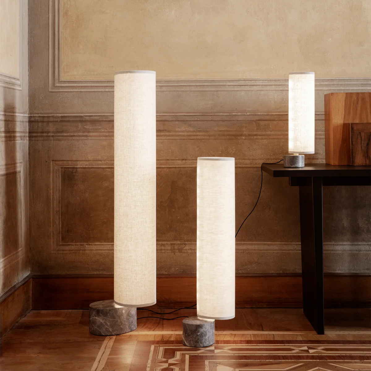 Die Unbound Serie von Space Kopenhagen für Gubi besteht aus verschieden großen Leuchten, die sich hervorragend kombinieren lassen. Der Sockel besteht aus Marmor, der schlanke Lampenschirm ist entweder als Segelstoff oder aus Leinen erhältlich.