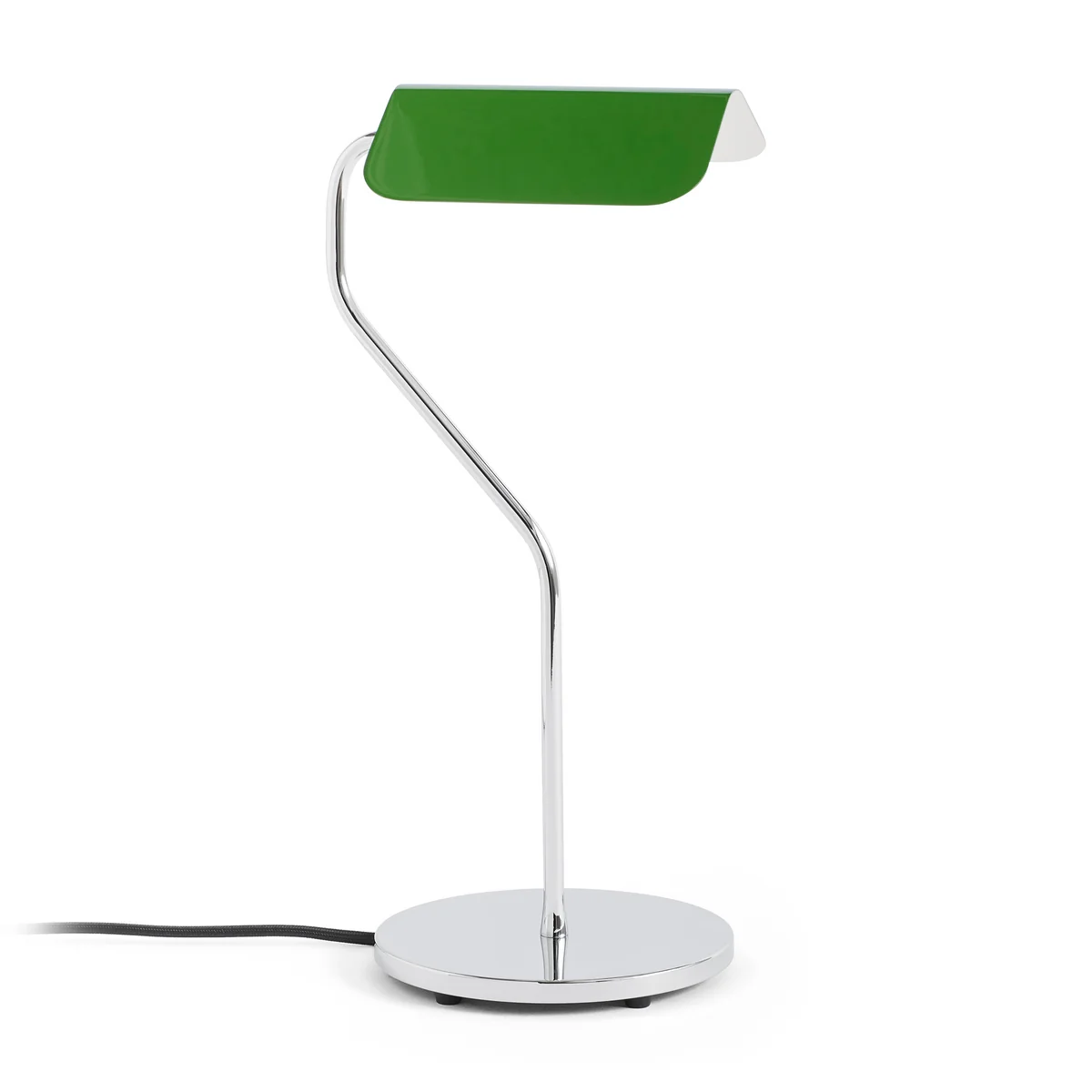 Die Apex Tischleuchte aus dem dänischen Hause HAY ist mit seinem Design an die klassische Banker's Light des britischen Designers John Tree angelehnt. Die gefalteten Stahlschirme erinnern mit ihrer stilvollen Silhouette an eine spitze Dachlinie, die als Inspiration für den Namen der Leuchte fungiert. Der runde, verchromte Sockel und der abgewinkelte Arm bildet einen großartigen Kontrast zu dem farbenfrohen Leuchtenschirm.