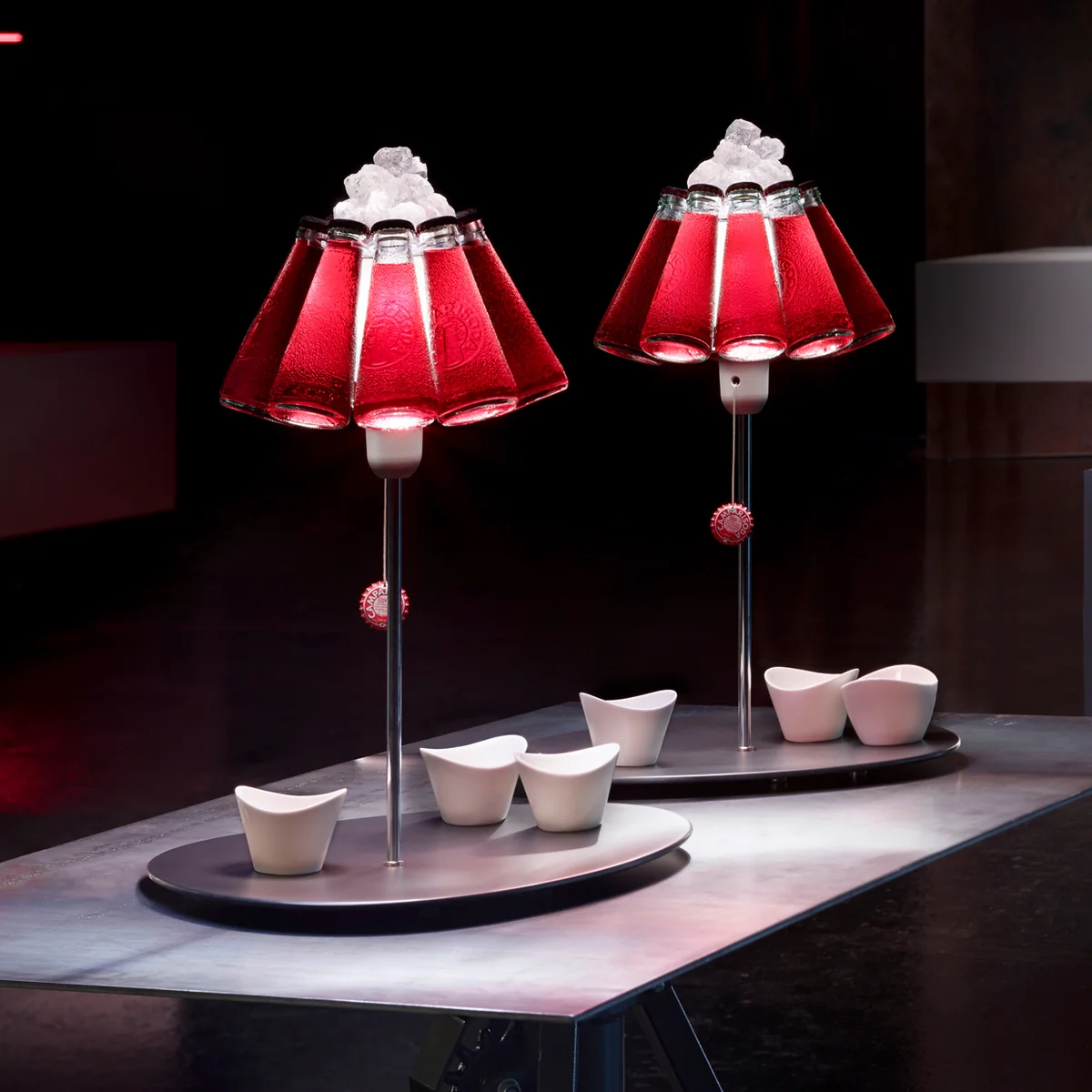 Der Fuß der Leuchte besteht aus Kunststoff, der Ständer aus Metall, die Eiswürfel aus Glas und der Schirm aus originalen, abnehmbaren und ersetzbaren Campari-Flaschen. Das Kabel ist transparent.