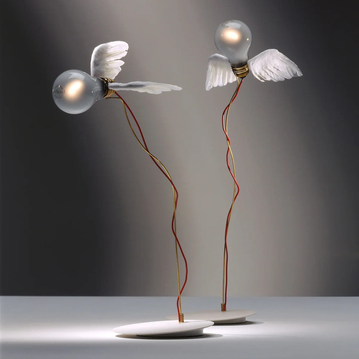 Lucellino verbindet die bekannte Glühbirne mit Flügeln und einer Konstruktion, die sie schweben lässt und ihr Dynamik verleiht. Das Drahtgestell von Lucellino lässt sich verbiegen, so dass die Leuchte frei ausgerichtet werden kann. Das Design der ungewöhnlichen Tischleuchte von Ingo Maurer stammt aus dem Jahr 1992. Der Name Lucellino ist ein Wortspiel und verweist auf das Design der Tischleuchte: Luce bedeutet Licht auf Italienisch, uccellino Vögelchen.