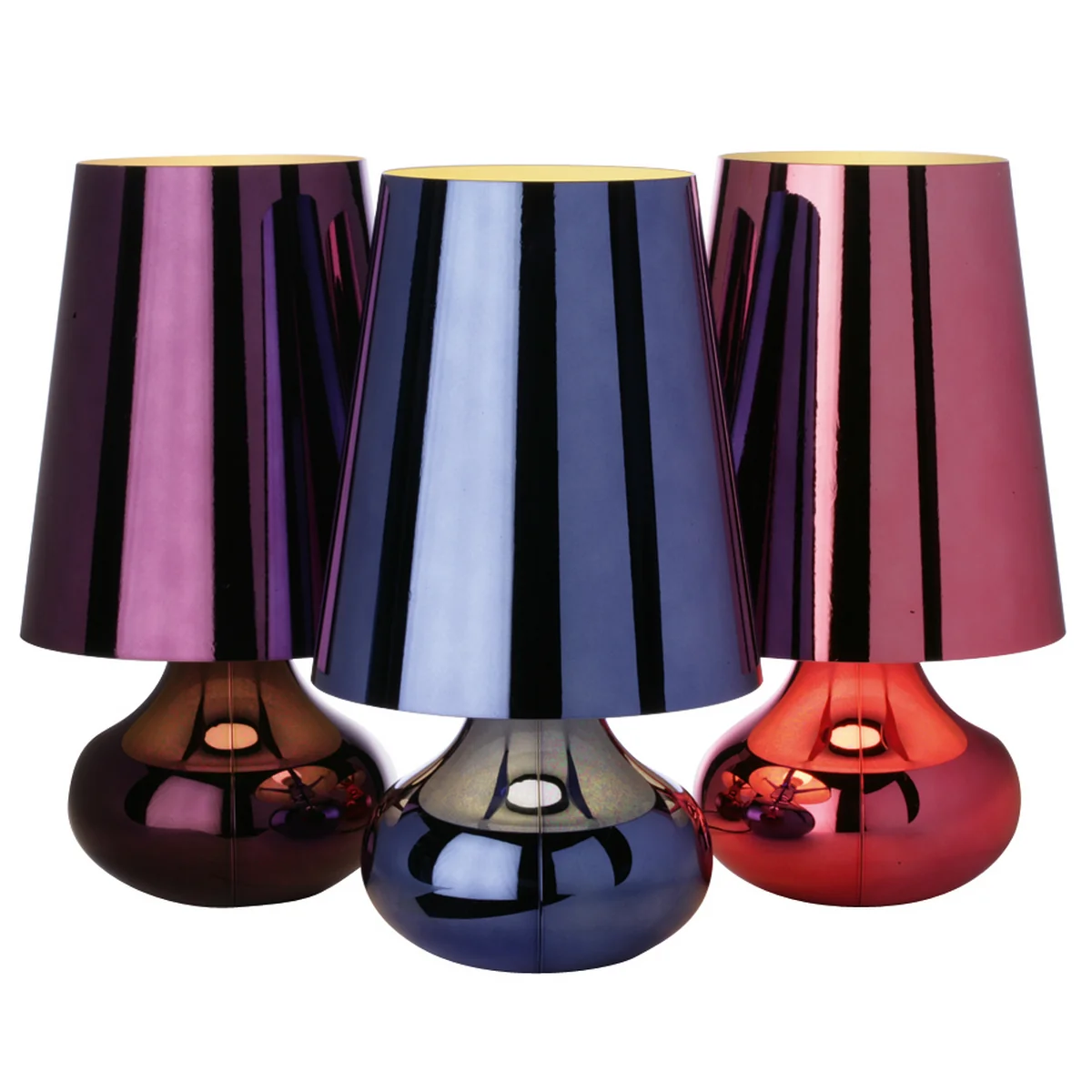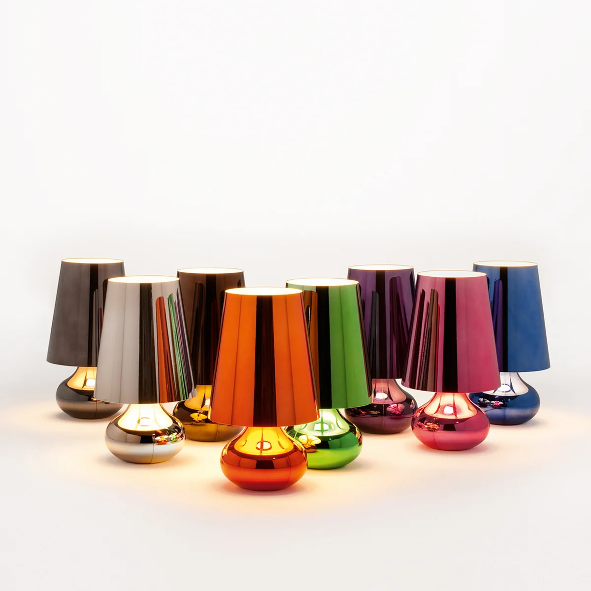 Cindy ist eine Neuinterpretation der typischen 70er Jahre Tischleuchte von Designer Ferruccio Laviani. Die kleine Leuchte besitzt ein glattes, in metallischen Farben gehaltenes Design, das unzählige schimmernde Reflexe erzeugt.
