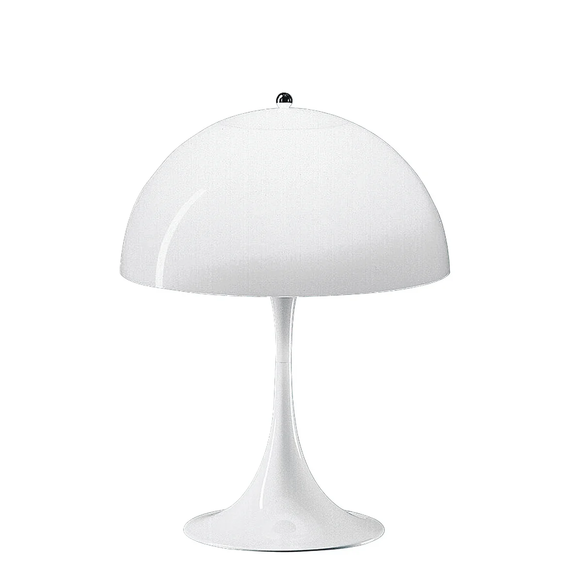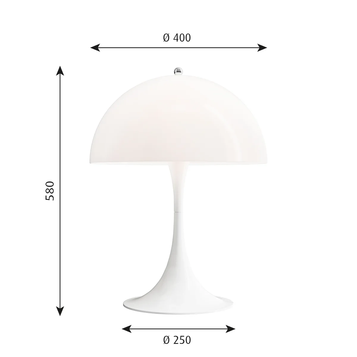 Das organische Design der Panthella Tischleuchte ist an die Form eines Pilzes angelehnt. Auf ihrer Spitze besitzt die Leuchte eine verchromte Kugel. Neben ihrer optischen Funktion dient die Kugel zum Anheben der Deckenplatte der Leuchte, die zum Auswechseln des Leuchtmittels entfernt werden muss. Im Boden der Tischleuchte kann außerdem nicht benötigtes Kabel verstaut werden.