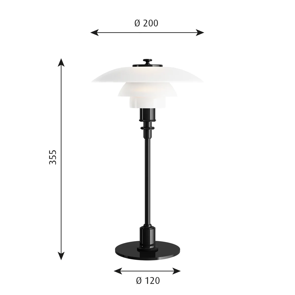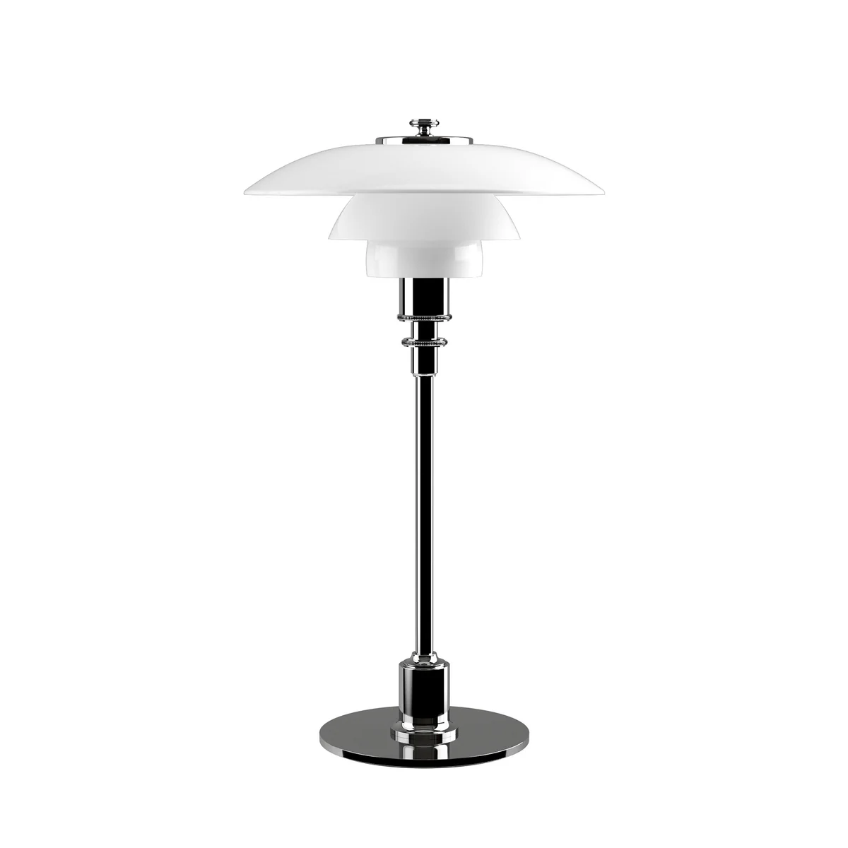 Gestaltet wurde die kleine Tischleuchte PH 2/1 ausgehend vom Prinzip eines reflektierenden Dreischirmsystems, das den größten Teil des Lichts nach unten leitet. Die drei Schirme werden von Louis Poulsen aus mundgeblasenem opalisiertem dreischichtigem Glas hergestellt. Innen sind die Schirme glänzend und außen sandgestrahlt, was zu einer weichen und diffusen Lichtverteilung führt. Der Sockel ist wahlweise aus gezogenem Aluminium in hochglanzverchromt, Messing oder schwarz metallisiert erhältlich. Das Textilkabel ist Schwarz.
