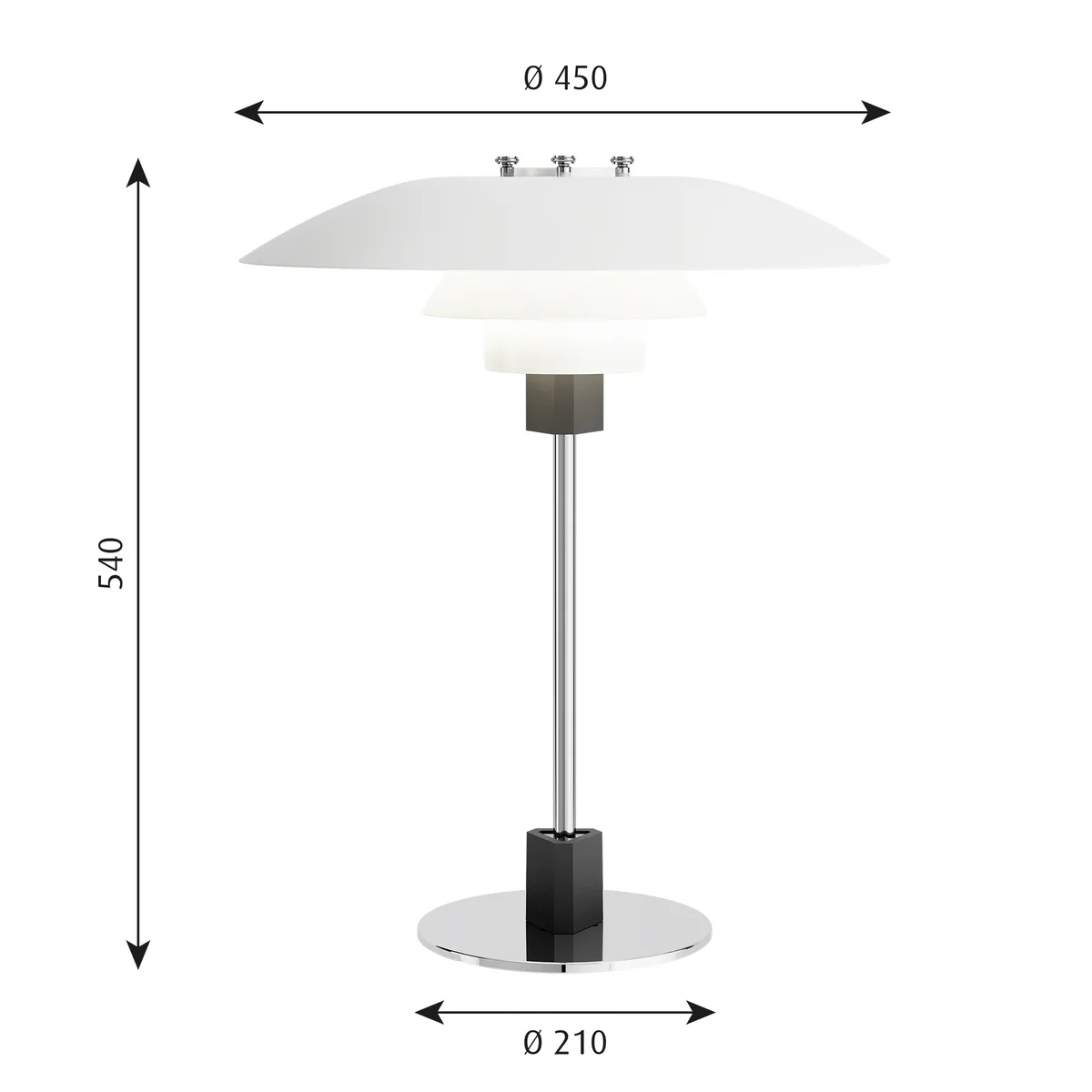 Die drei Schirme werden von Louis Poulsen aus lackiertem, gezogenem Aluminium gefertigt, was für eine diffuse und komfortable Lichtverteilung sorgt. Der Standfuß ist hingegen hochglanzverchromt und schafft damit einen harmonischen Kontrast zum zarten Schirm.